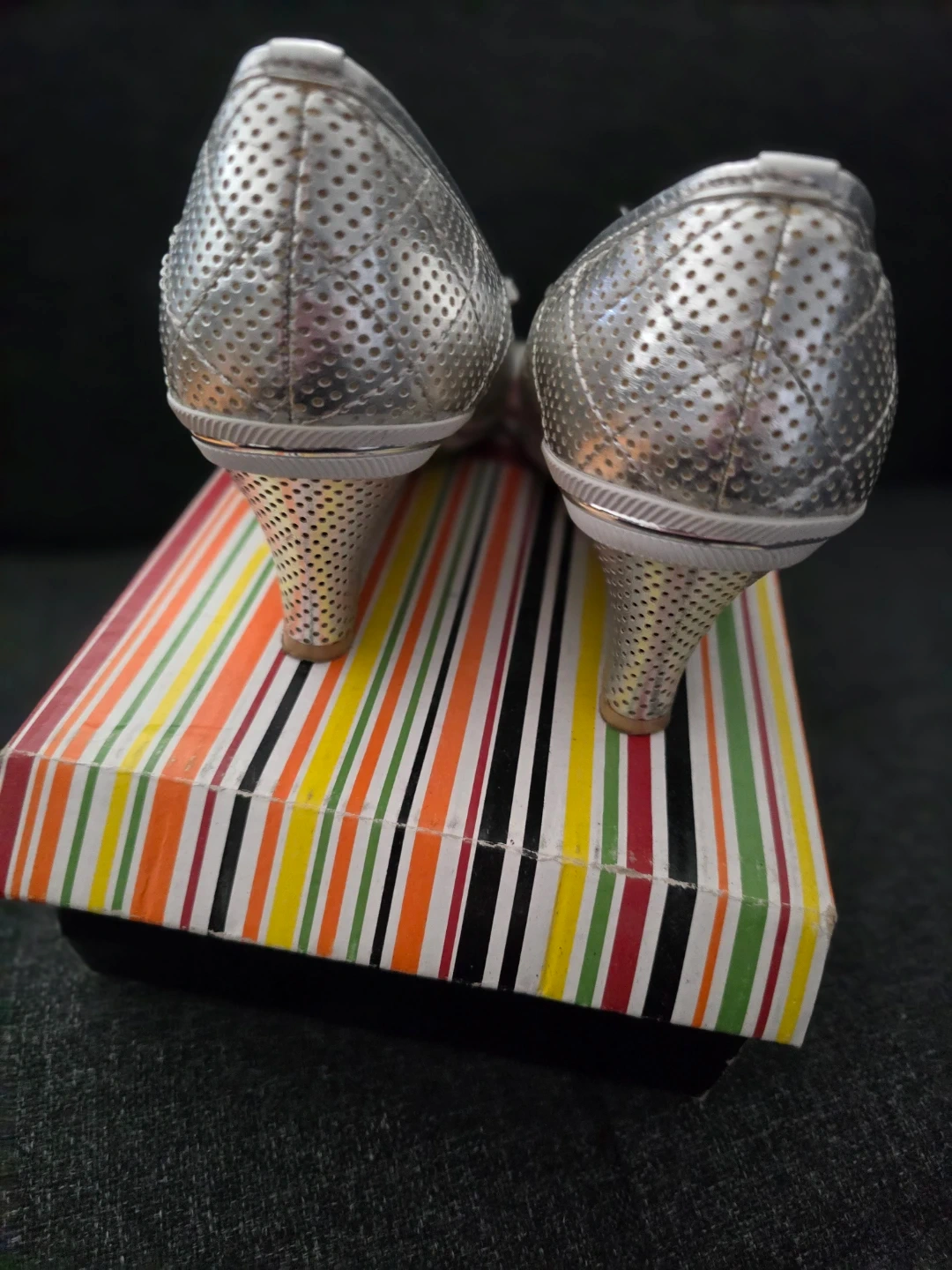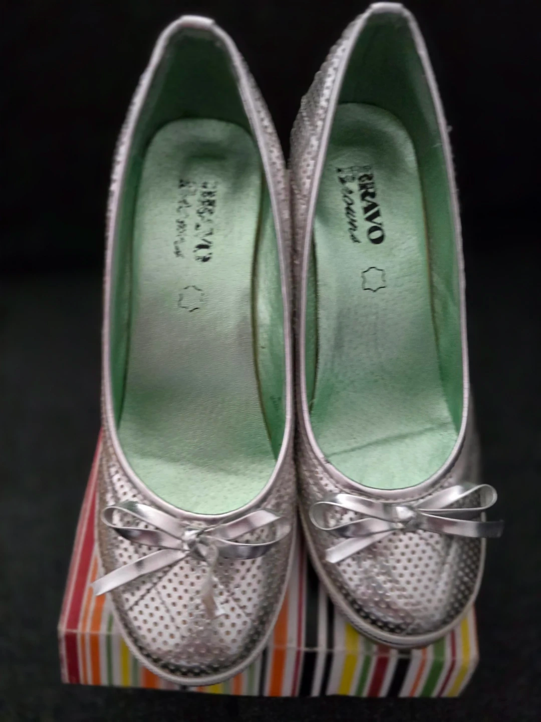 Bravo Woman wedge espadrilles in a shiny silver finish. Perforated design with a small bow detail on the toe. Includes original box.