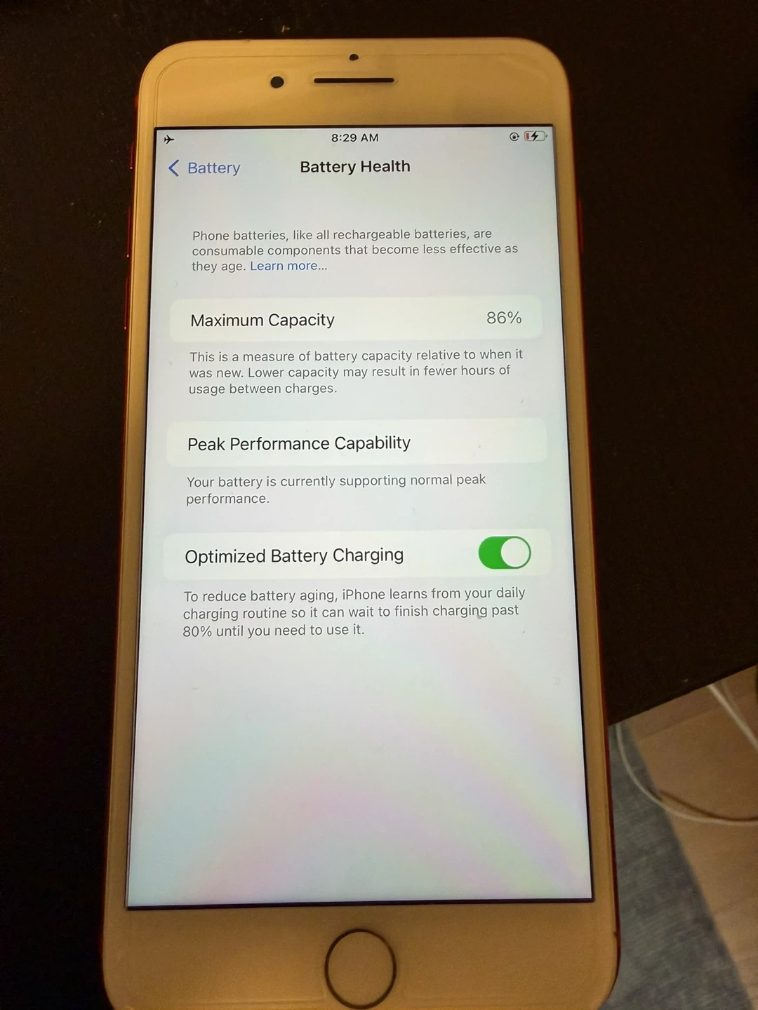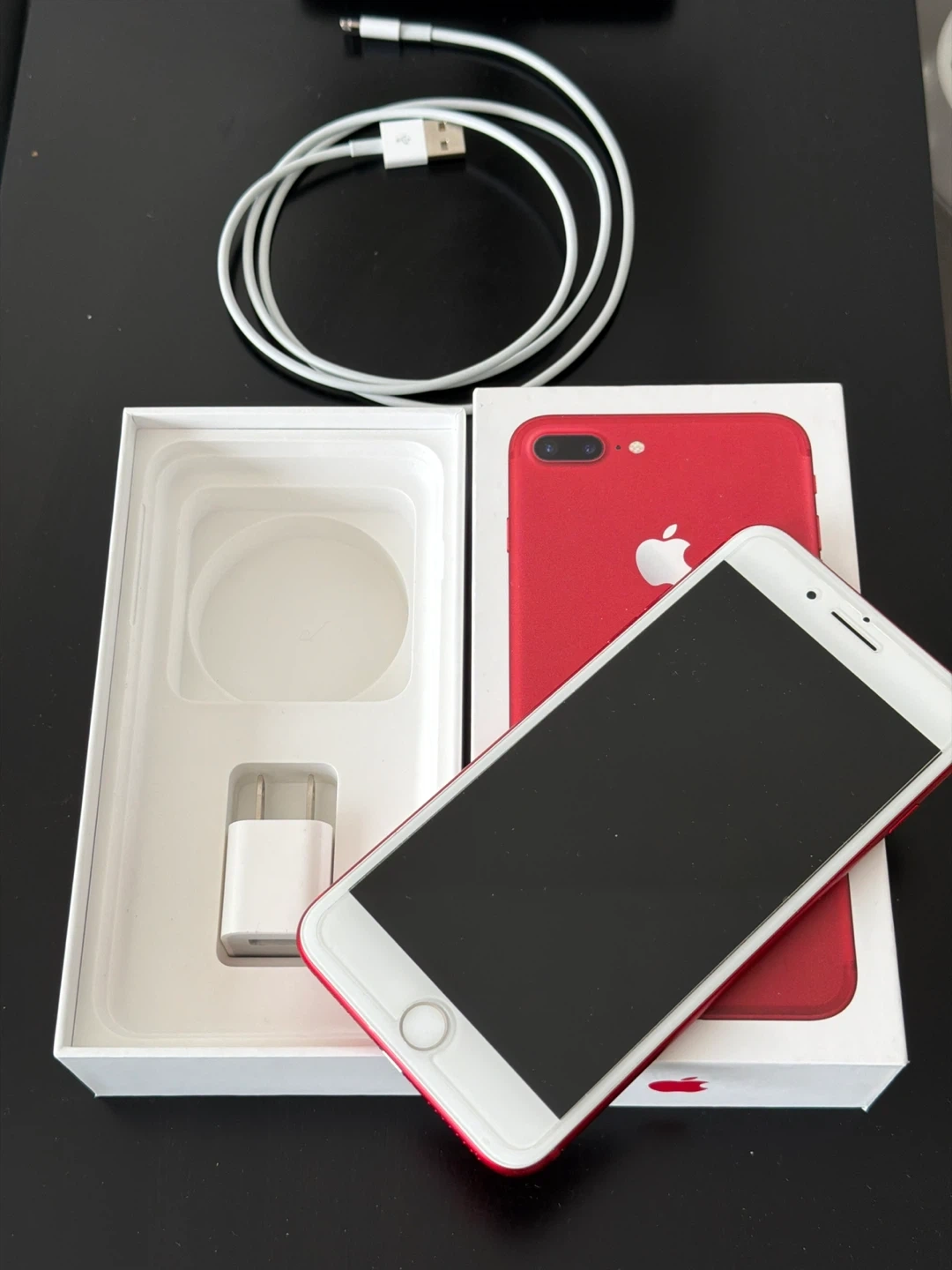 Selling a red Apple iPhone 7 Plus with 128GB storage. It comes with its original box, USB cable, and power adapter. Battery health is at 86%.