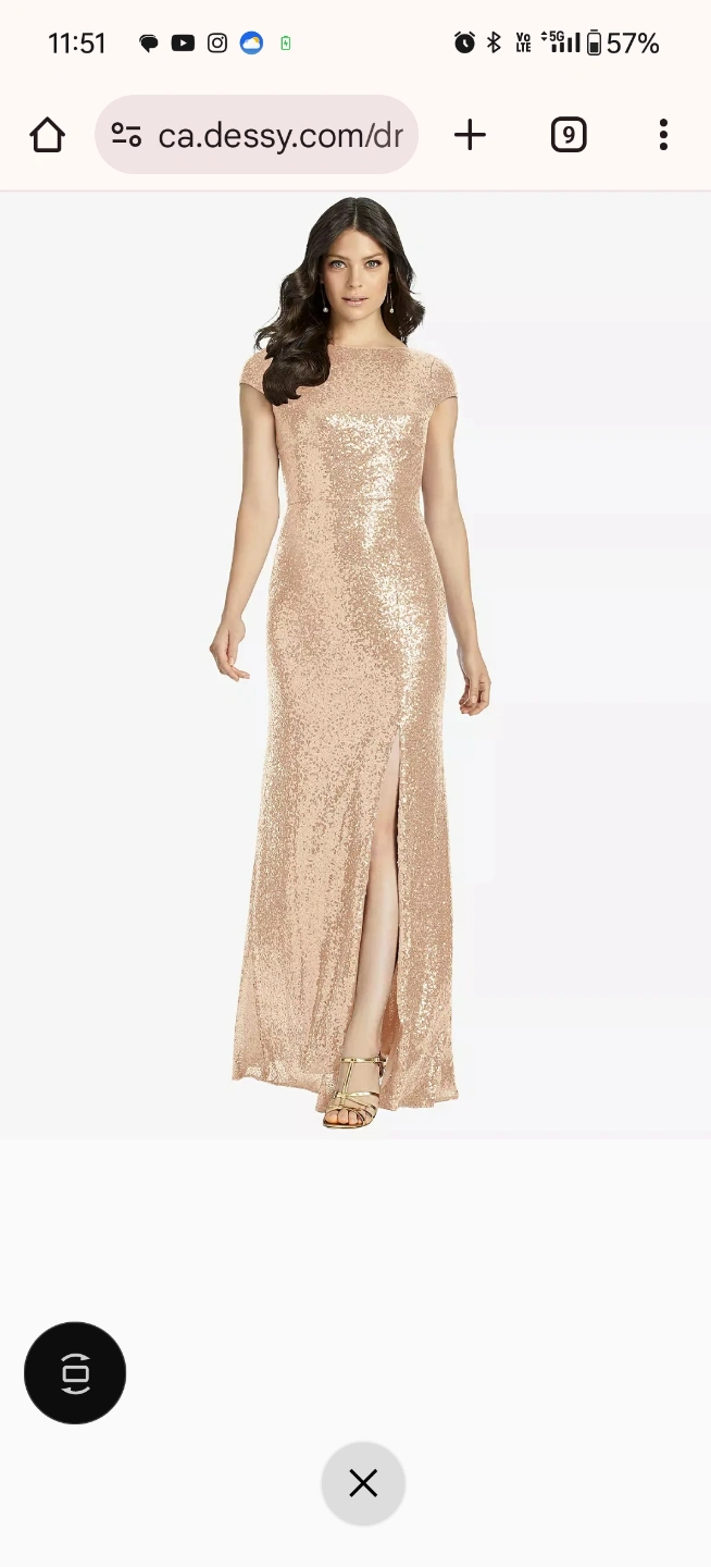 Floor length bridesmaid dress. Sequin fabric. Short sleeves. High neckline. Leg slit. Dessy Collection