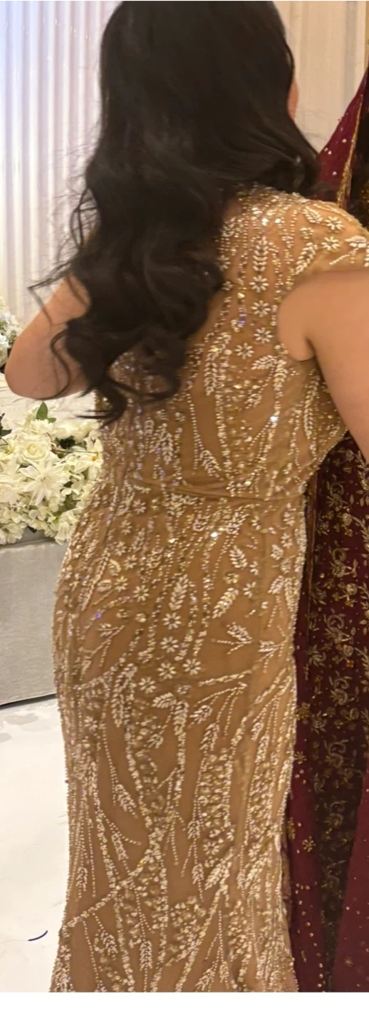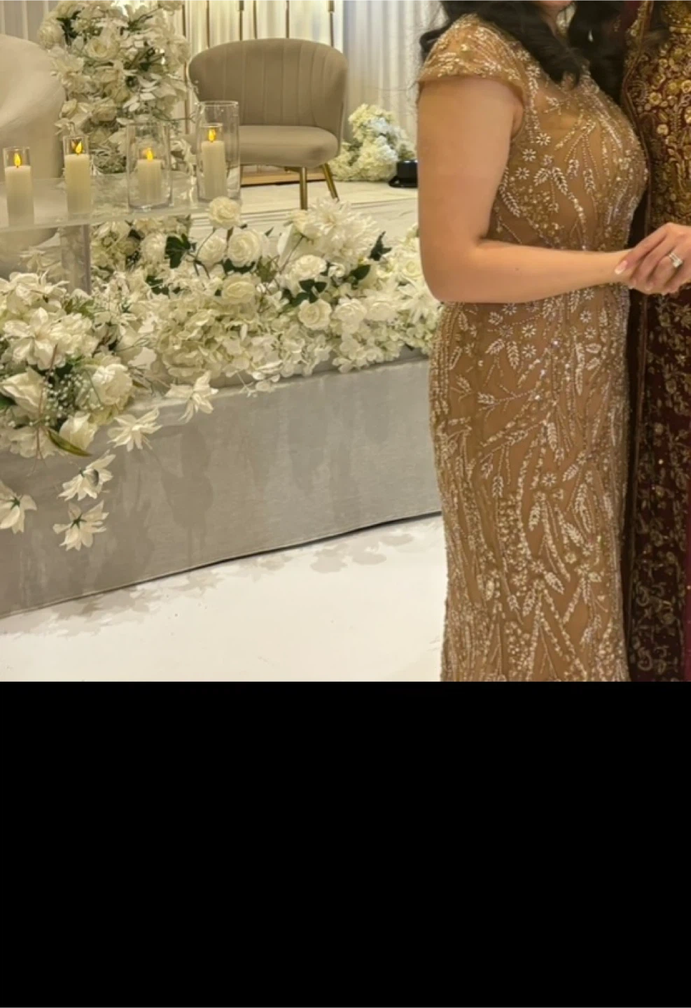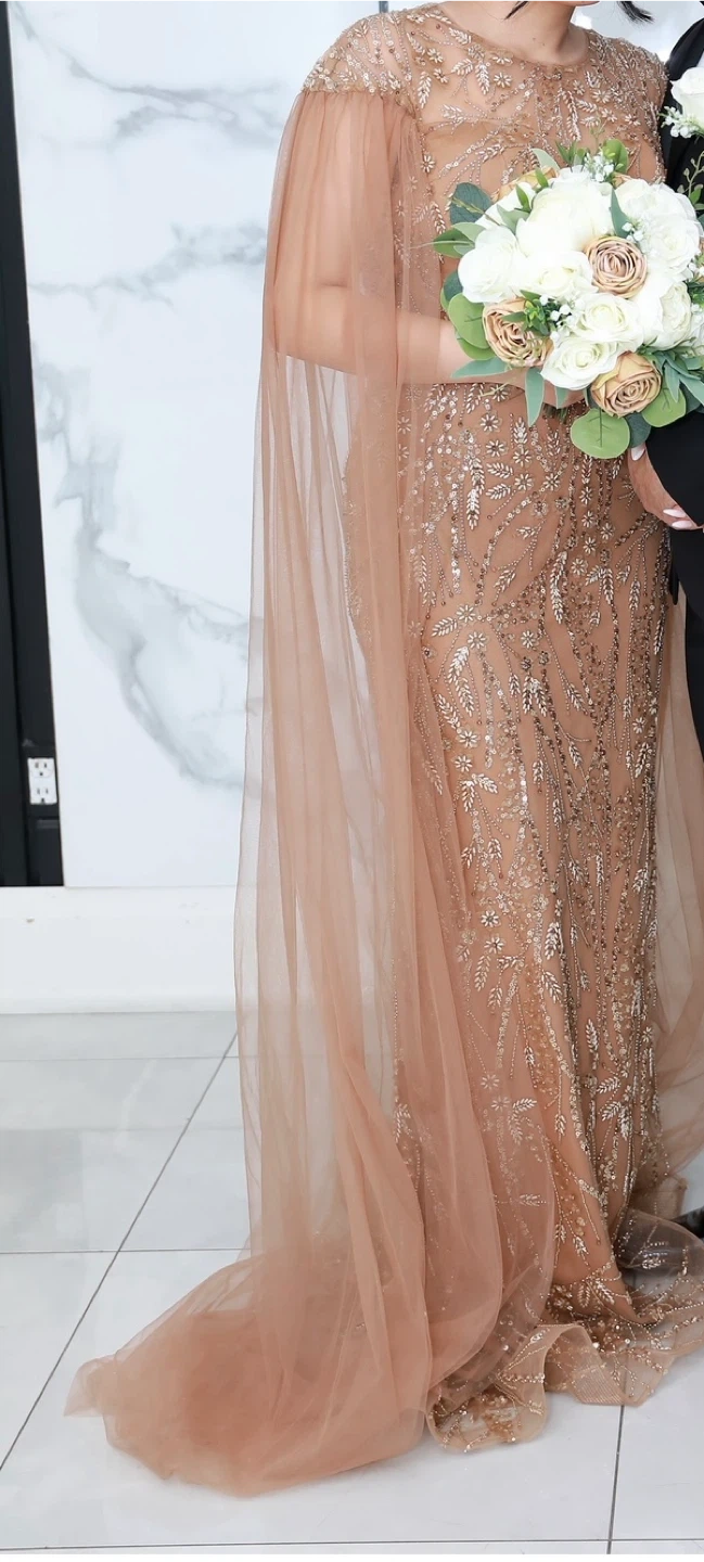 Beautiful sequin embellished gown, perfect for a special occasion! The dress is a lovely gold/nude colour and features intricate detailing. It has a cape and a fitted silhouette.
