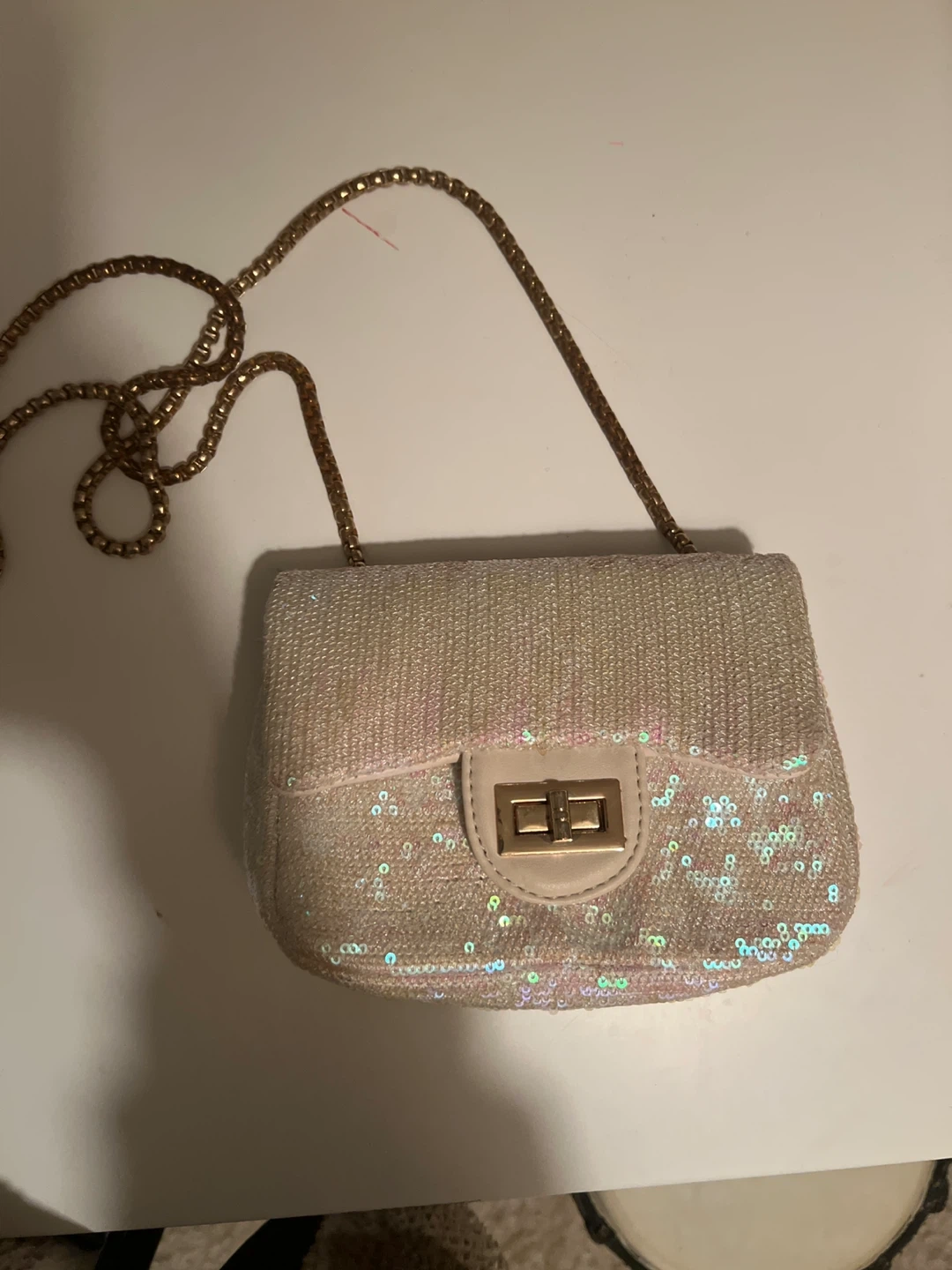 This is a cute little sequin evening bag with a gold chain. It's perfect for parties or a night out!
