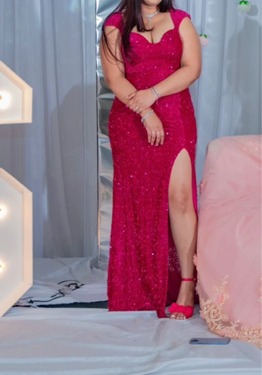10Hot pink sequin dress, perfect for a formal occasion! It features a flattering silhouette and a stylish high slit. Worn once for 10 mins