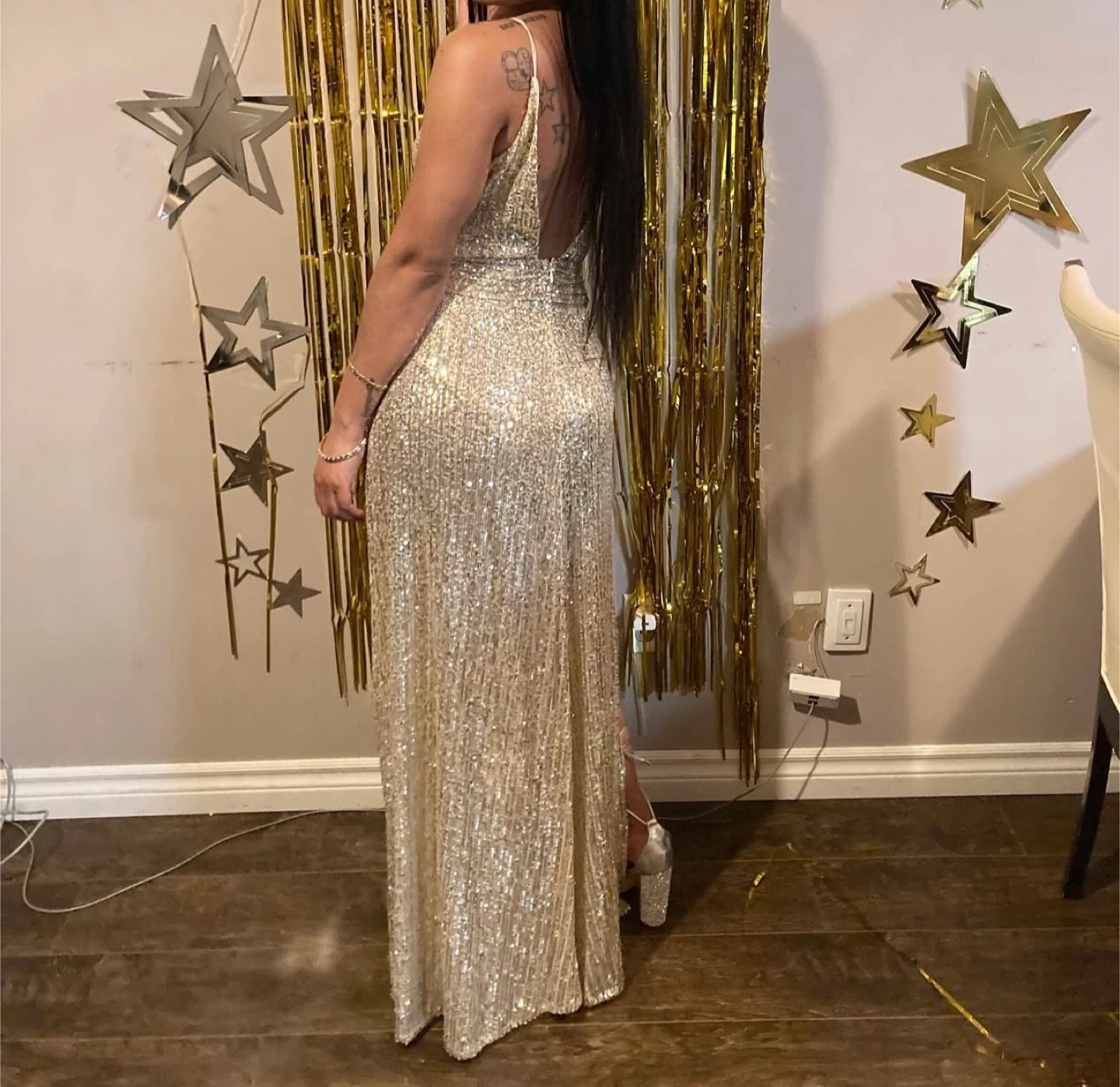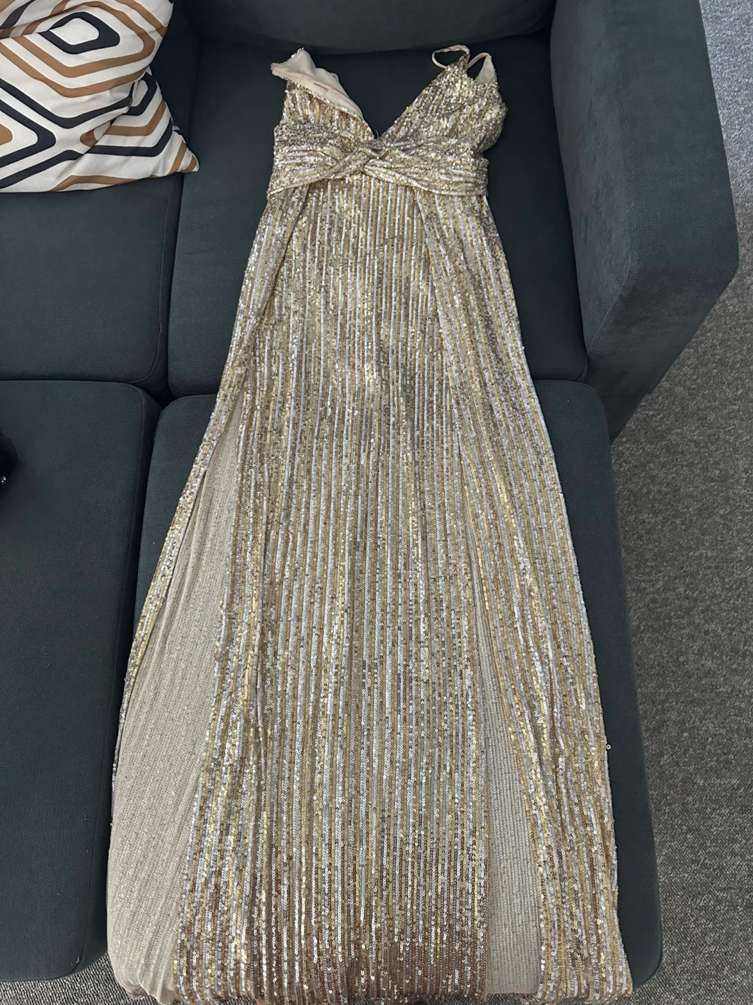 Selling a stunning sequin gown that's sure to turn heads! This dress features a flattering silhouette with a deep V-neckline and daring double slits. Perfect for a special occasion or a night out on the town! Worn once for 2 hrs