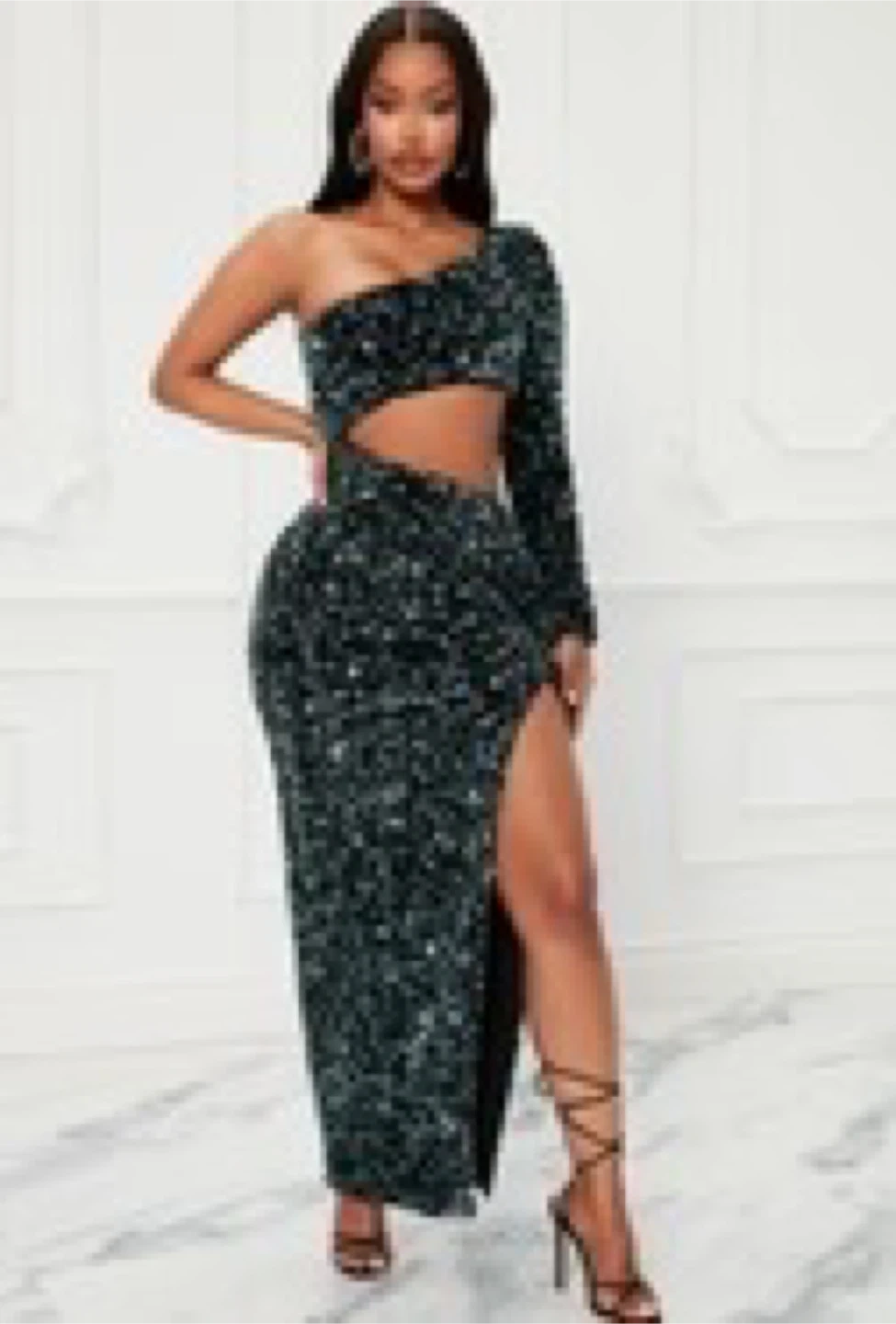 5This is a stylish sequin dress with a one-shoulder design and a cutout detail. It's perfect for a night out or a special occasion