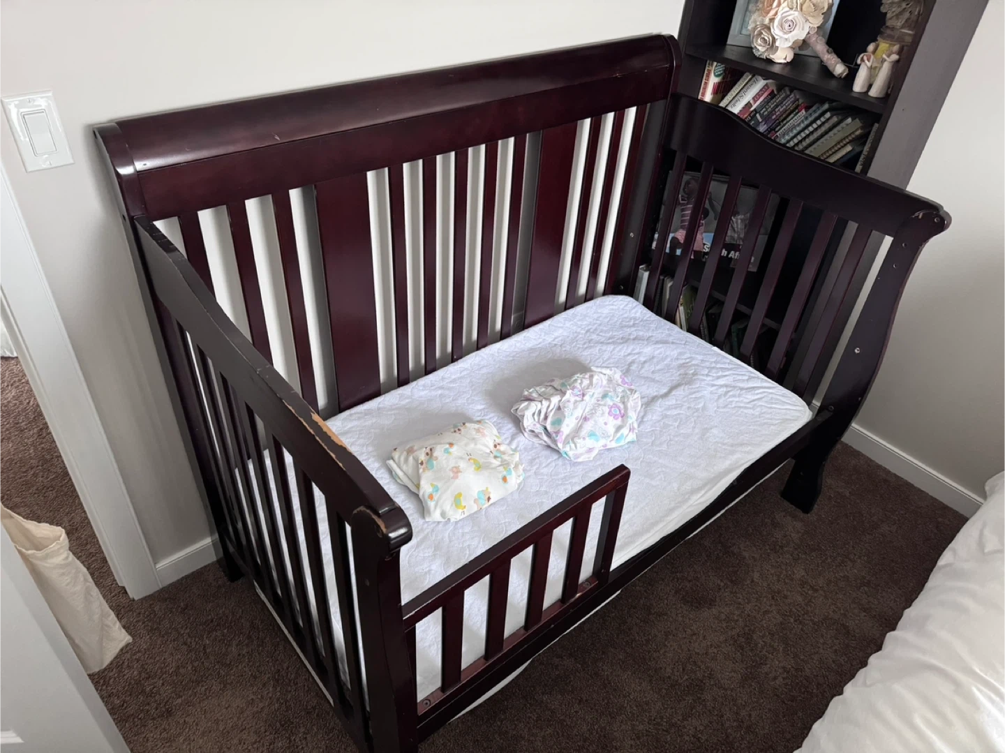 Selling a convertible baby crib in a dark wood finish. It has some signs of use, as shown in the pictures, but is still in good working condition. Perfect for a nursery or for those aunties/uncles/grandparents who love having their littles over for a sleepover! Comes with mattress, mattress cover, and two fitted sheets. Can be used as a daybed (shown in picture) or an adjustable height crib. Pick up Northwest Calgary