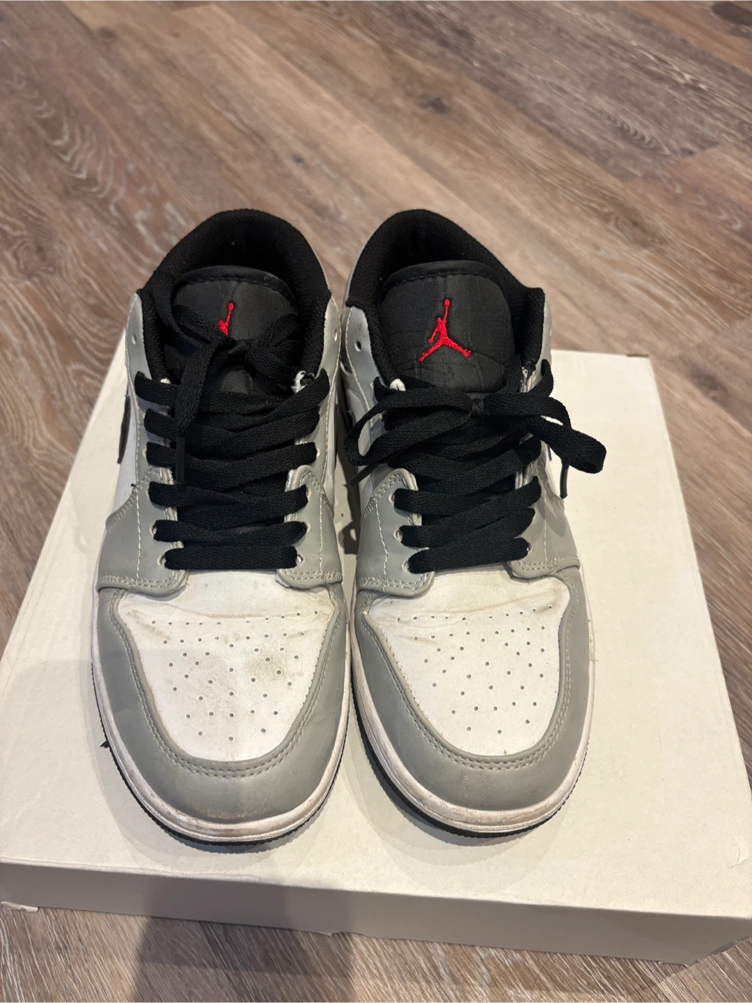 Selling a pair of Air Jordan 1 Low sneakers in a light smoke grey color way. They are in good condition, as shown in the photos. Size US 8