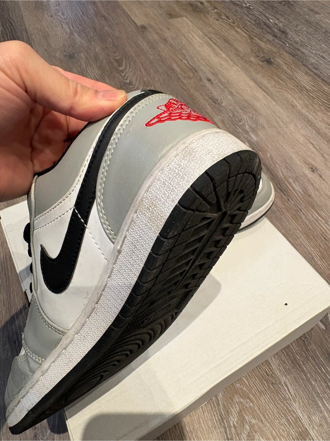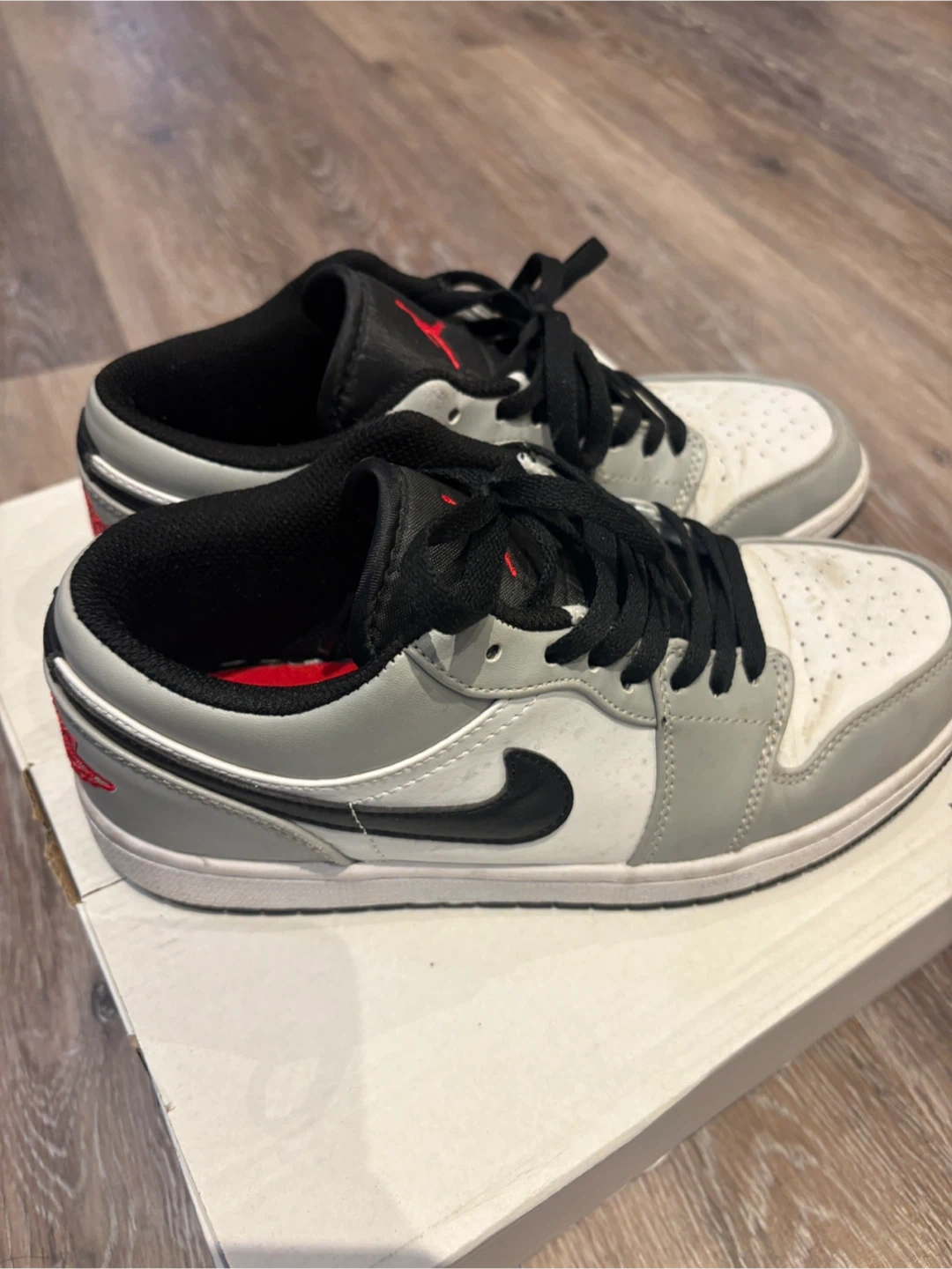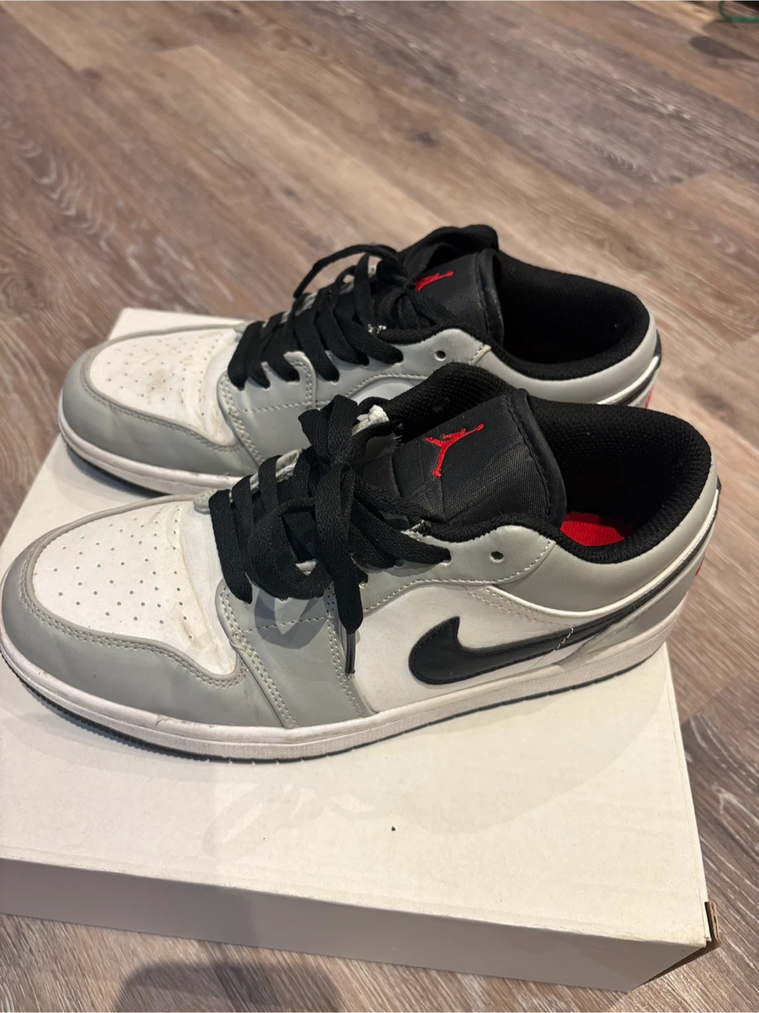 Selling a pair of Air Jordan 1 Low sneakers in a light smoke grey color way. They are in good condition, as shown in the photos. Size US 8