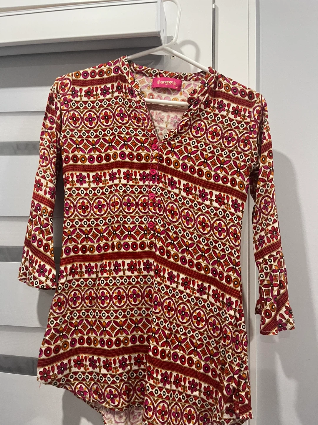 10Cute Serefina tunic blouse in size small! The blouse features a vibrant pattern with red, orange, and pink tones. It's in great condition and ready for a new home!
