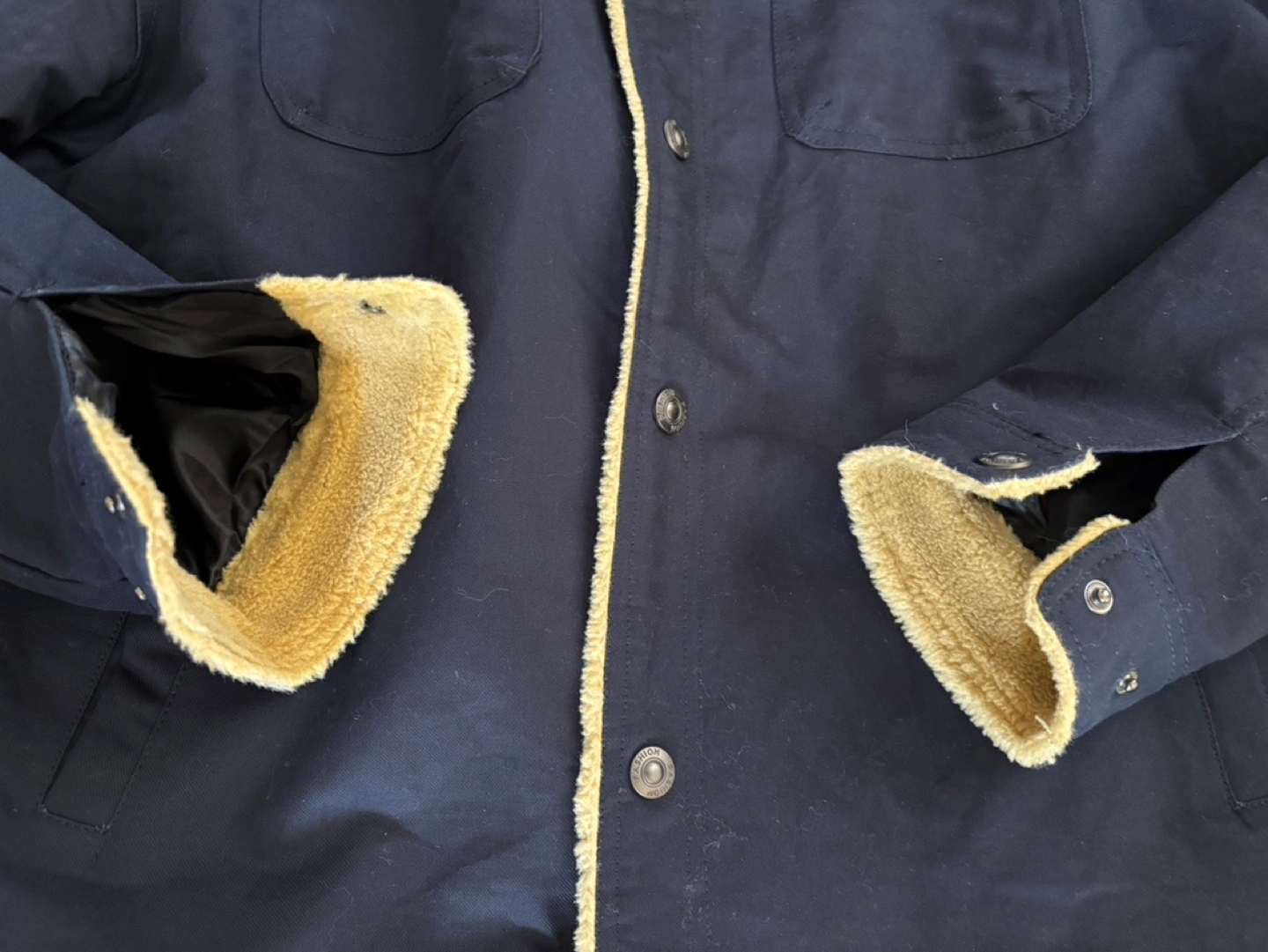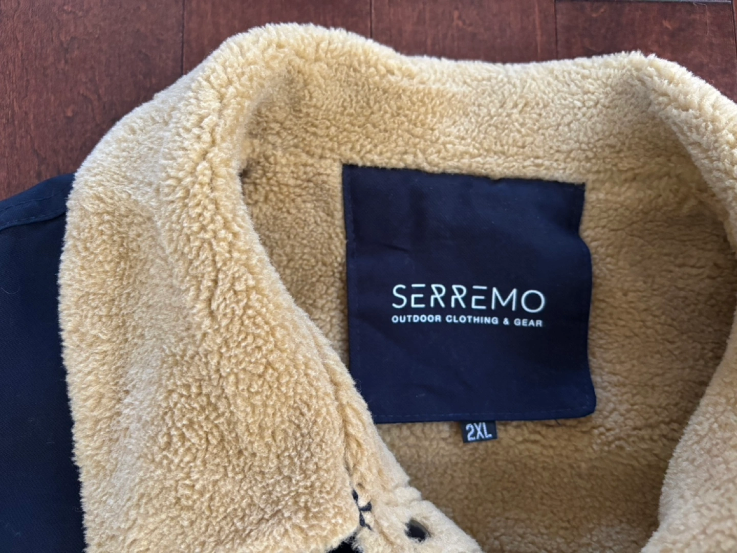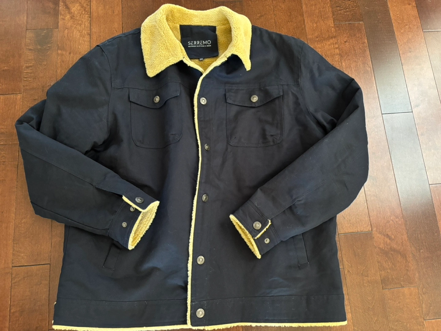 Serremo Men's 2XL Sherpa Lined Jacket. Men's navy blue jacket. Sherpa lined collar and cuffs. Button closure. Two chest pockets. Great for colder weather. Fits XL like new