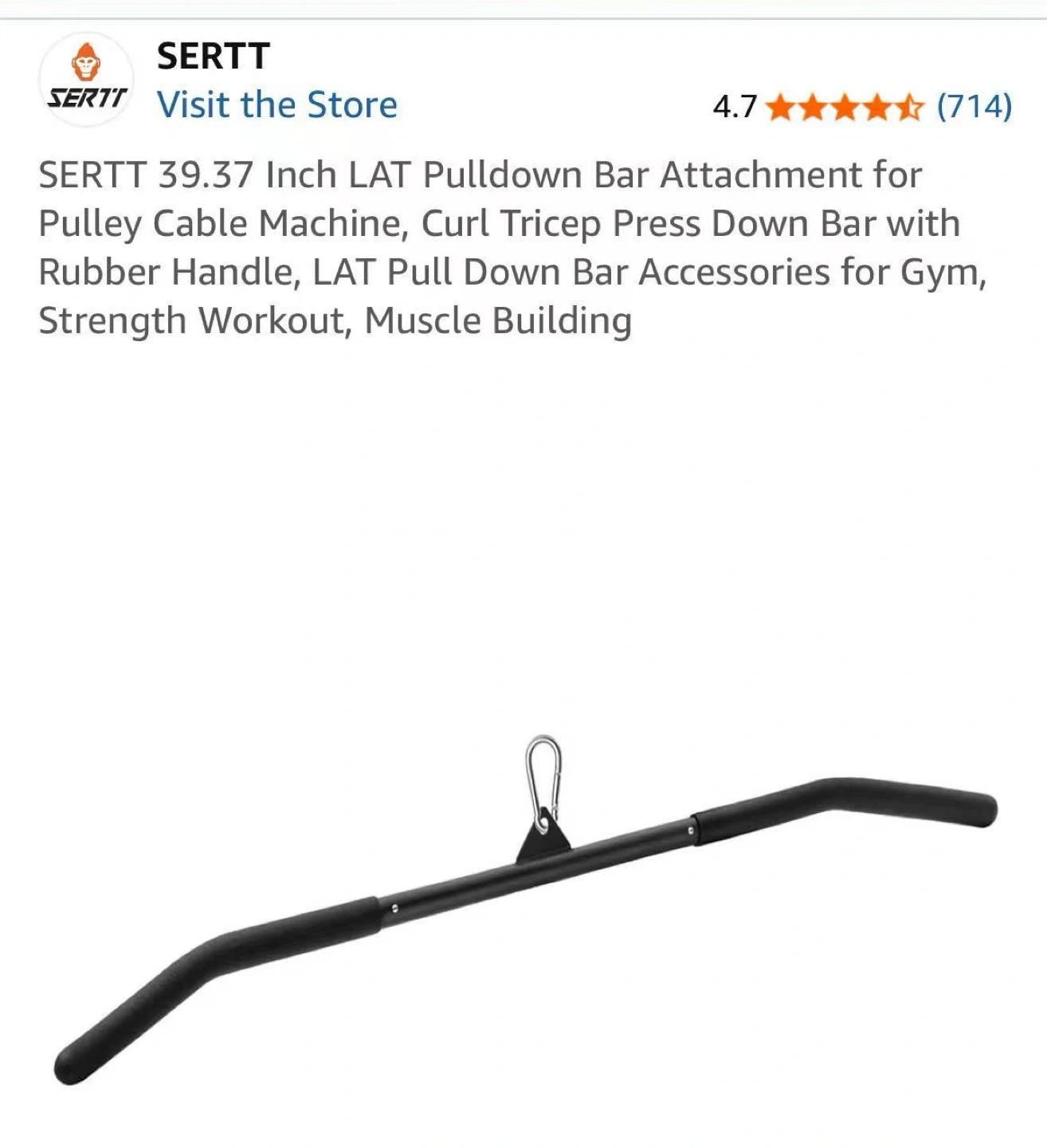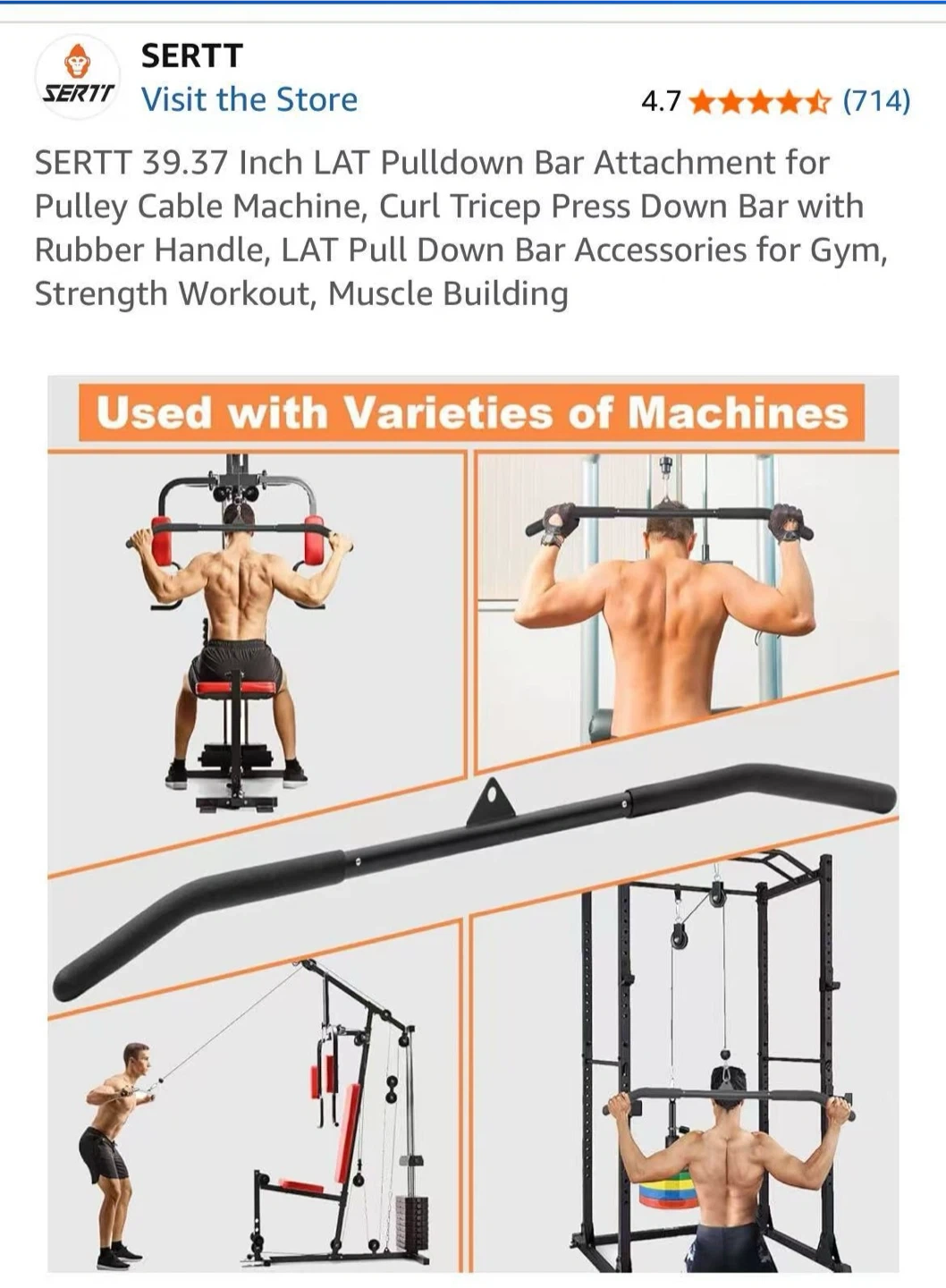 Get ready to level up your home gym with this SERTT LAT pulldown bar! It's a 39.37-inch attachment designed for pulley cable machines, perfect for curl tricep press downs. Great for strength workouts and muscle building, this bar has a rubber handle for a comfortable grip. It's a fantastic addition to your gym accessories!