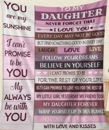 A soft blanket with loving messages for a daughter. The blanket features phrases like "I Love You", "Follow Your Dreams", and "Believe in Yourself". It's perfect for snuggling up and feeling loved.