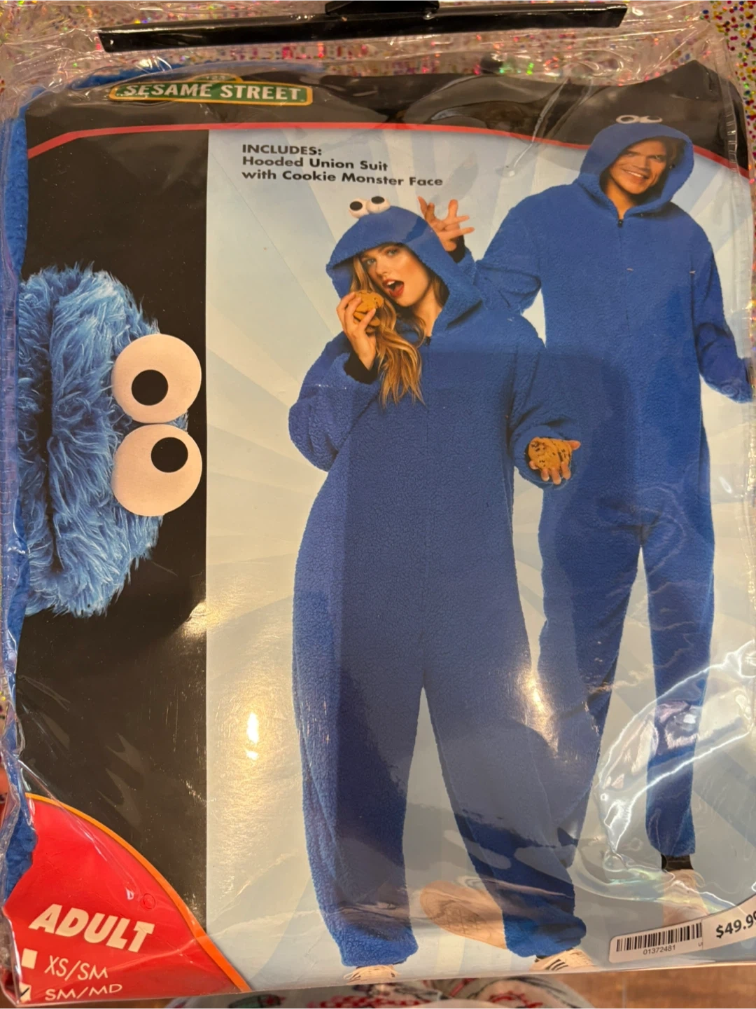 Cozy up with this Sesame Street Cookie Monster hooded union suit! It's an adult size SM/MD). it includes a hooded onesie with a Cookie Monster face. Originally priced at $49.90.