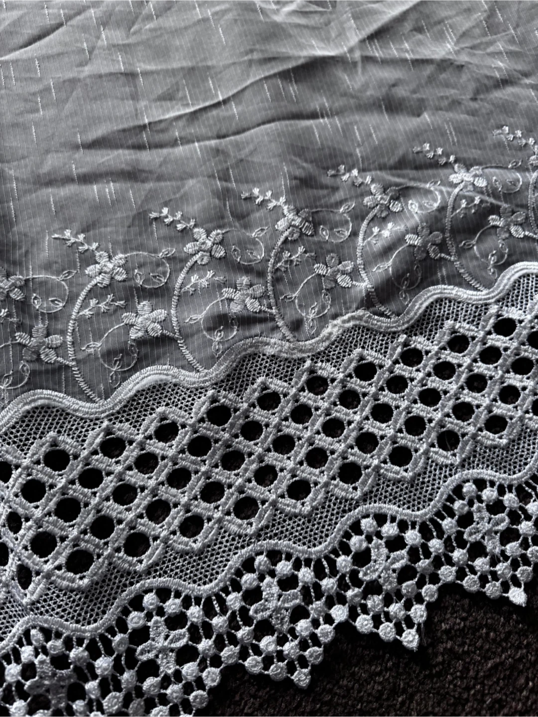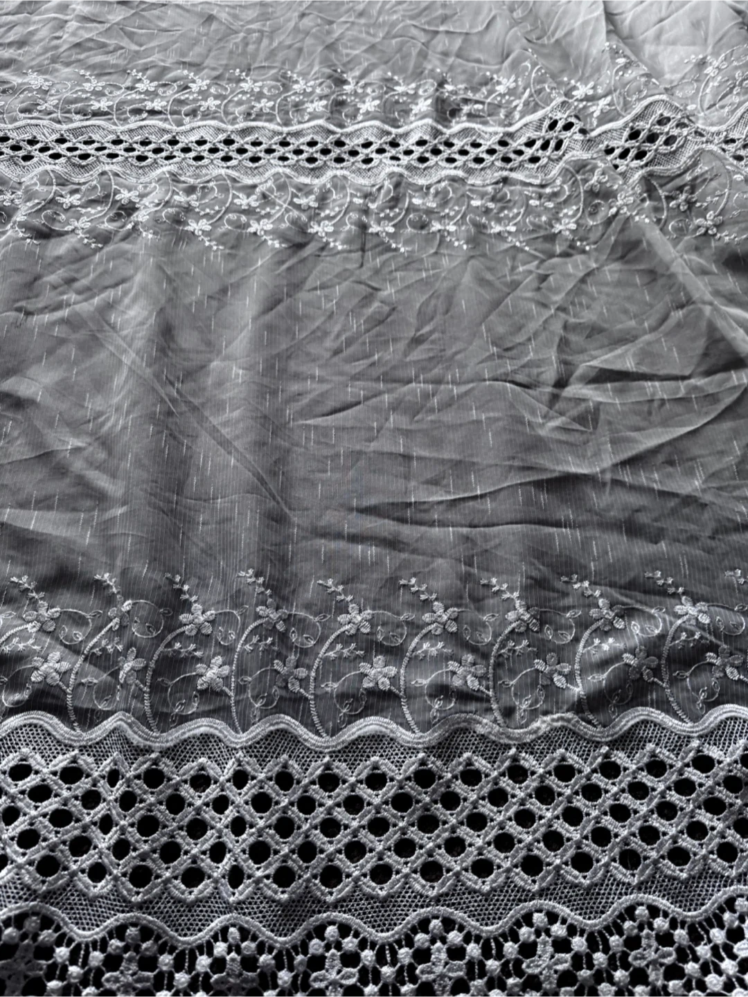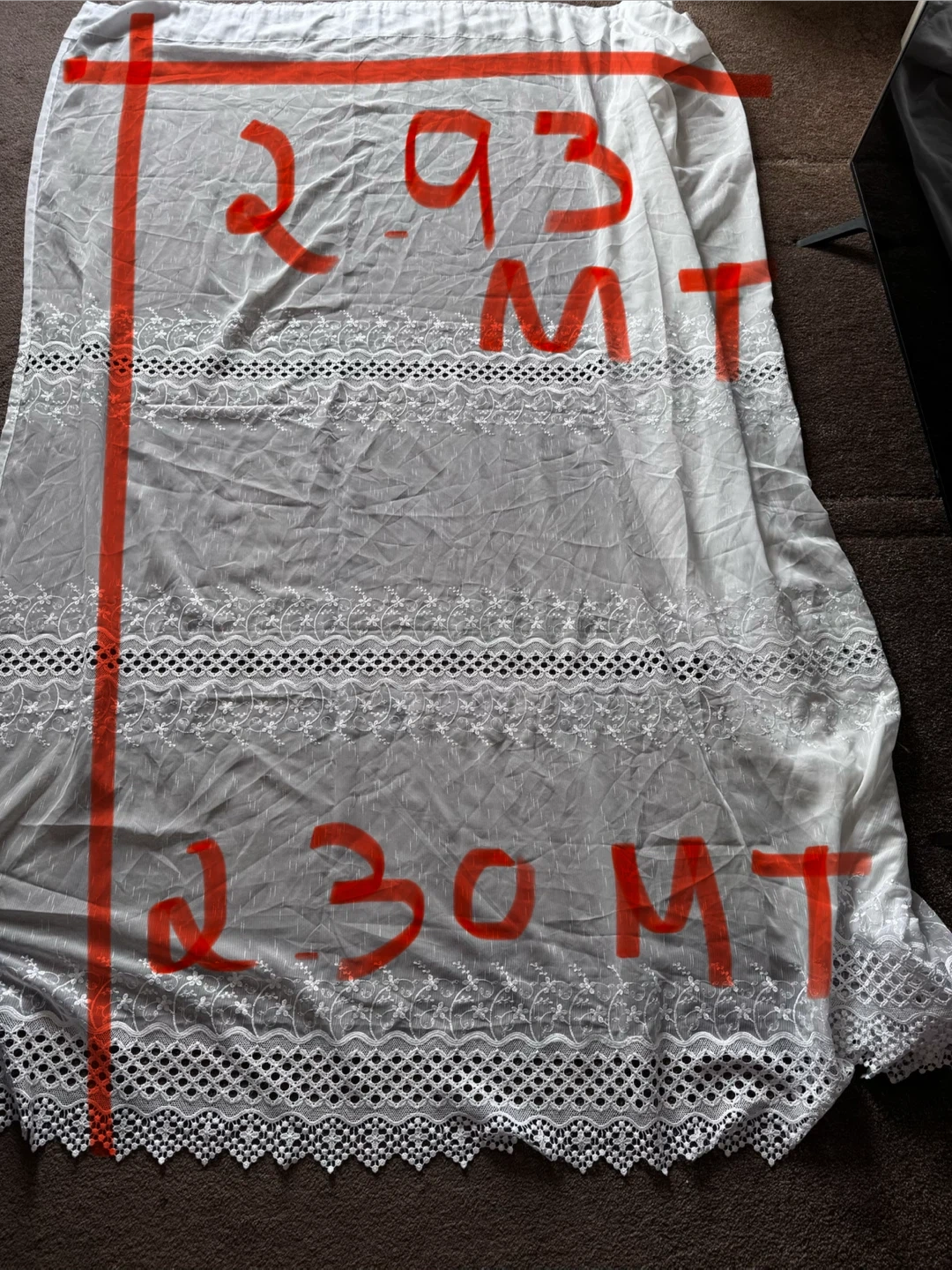 32Selling a beautiful set of 4 white embroidered lace curtains. They measure approximately 2.93 meters in length and 2.30 meters in height. Perfect for decorating your living room or bedroom to add a delicate touch to your home decor! A unique set of 4 pieces.