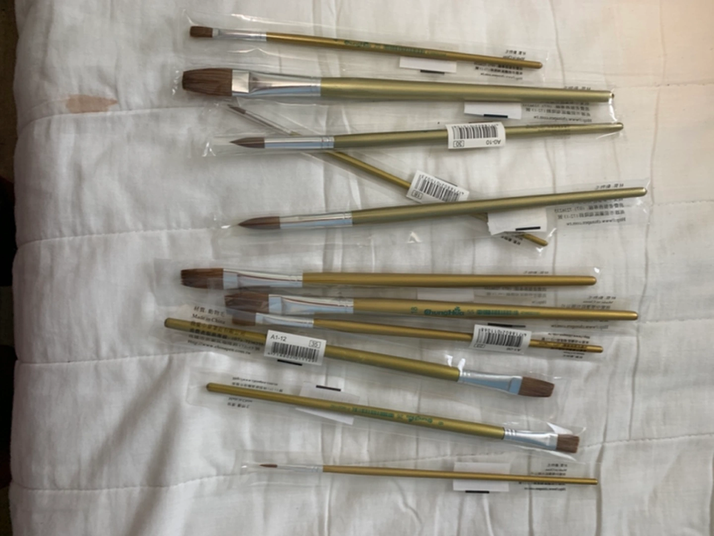 48Ten gold-handled paintbrushes, various sizes. New, individually packaged. Made in China.