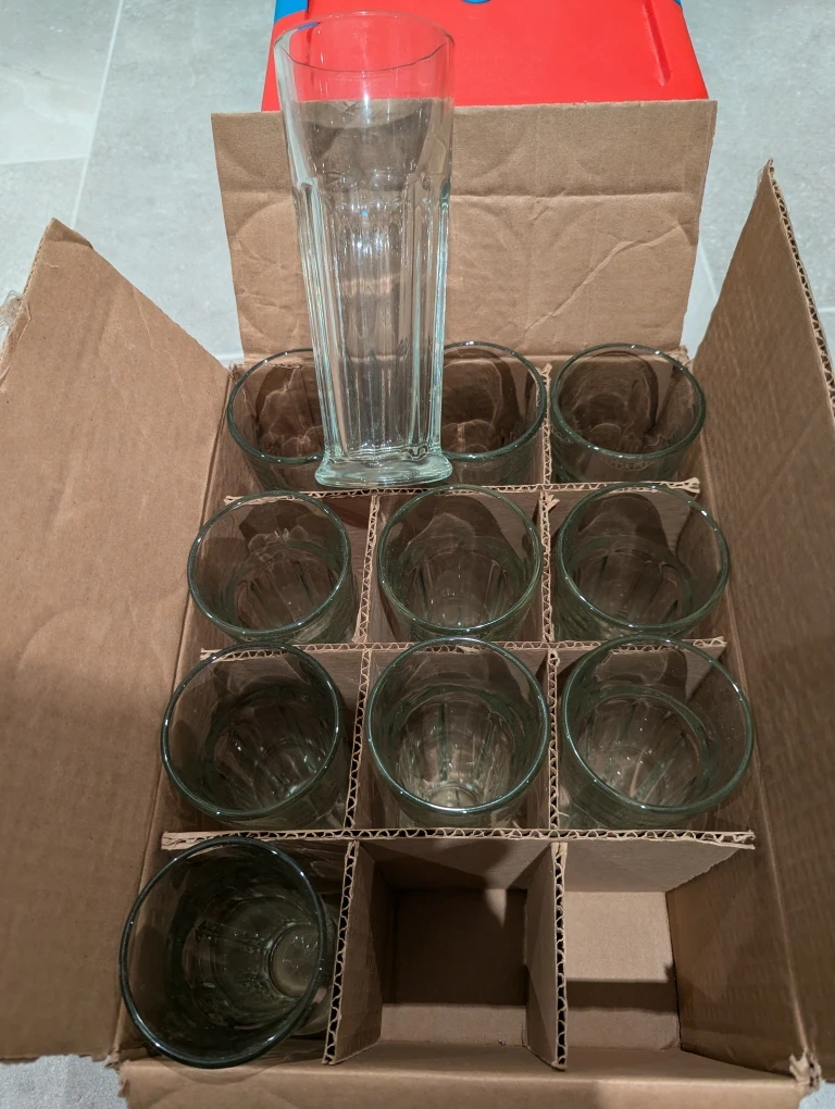 12Selling a set of 11 clear drinking glasses. They come in a box, making them easy to transport. Perfect for everyday use or for stocking up your kitchen!