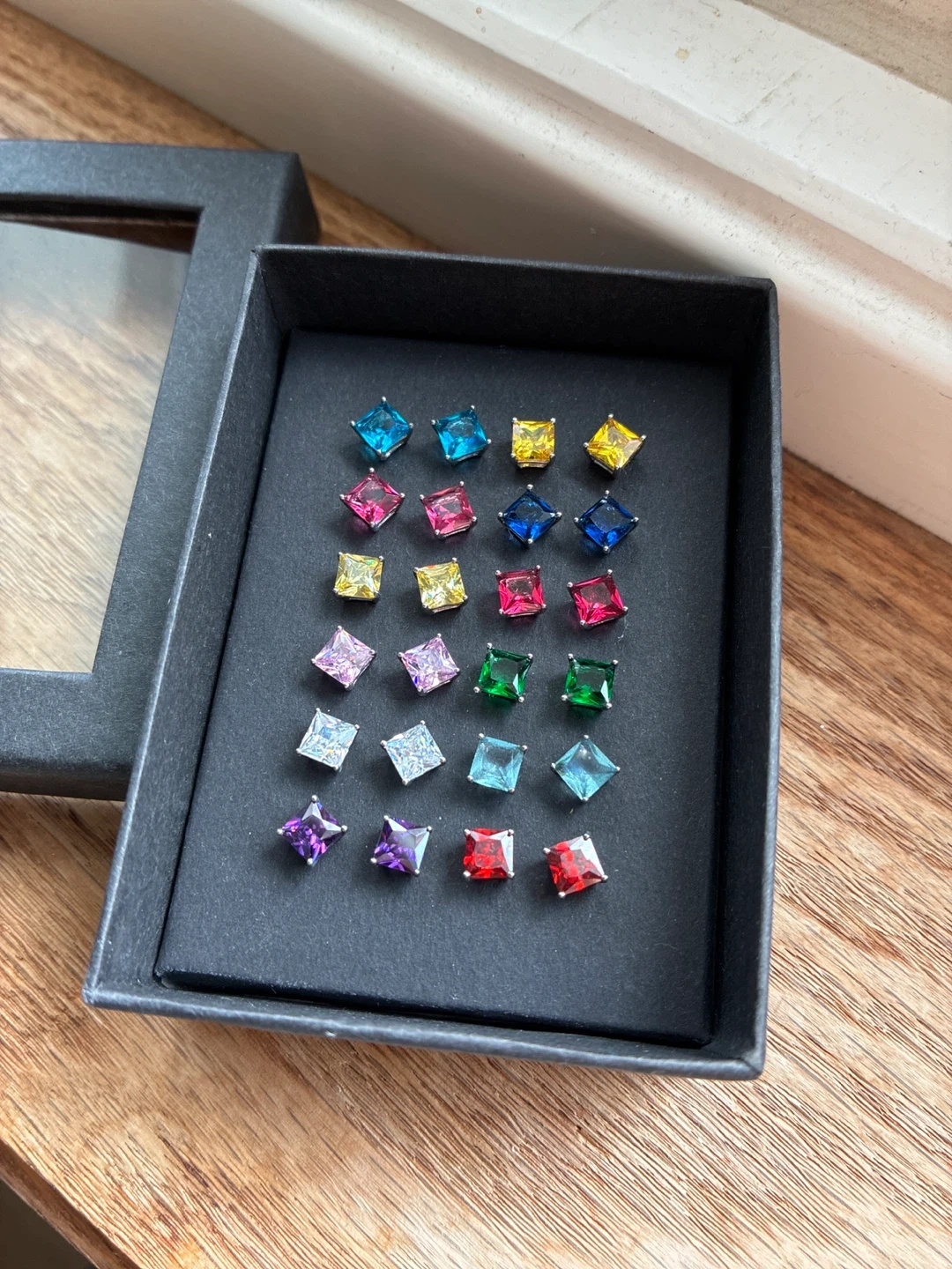 Selling a set of colourful stud earrings. These square-cut earrings come in a variety of colours. They are in a box, perfect for gifting or keeping them organized! Also willing to sell individual pairs for $5 each.