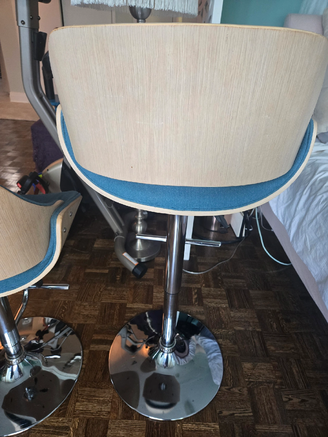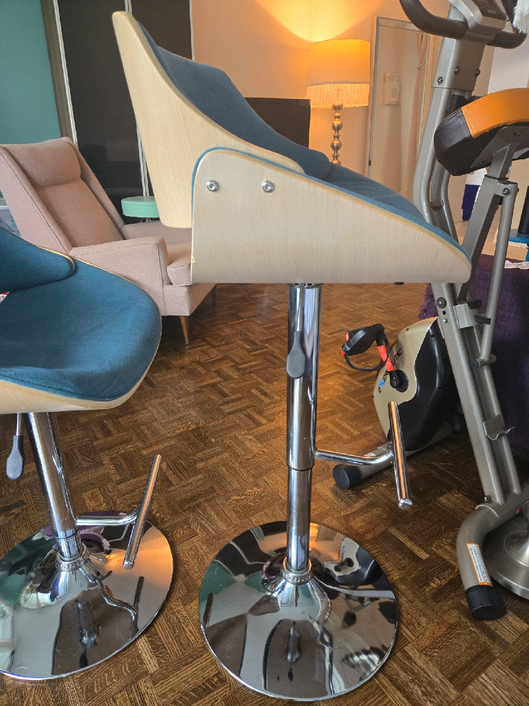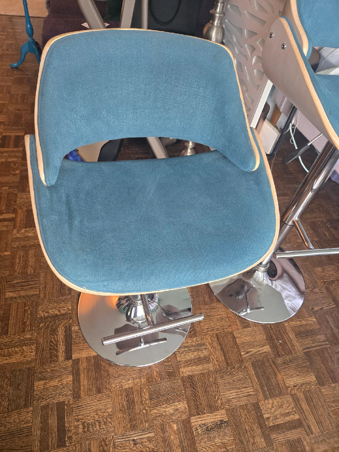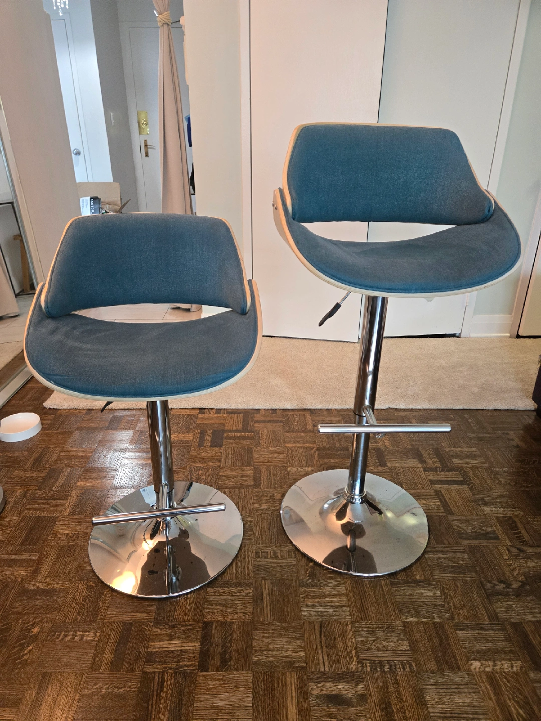 Selling a set of two adjustable height bar stools. They have a modern design with a chrome base and a comfortable seat. The seat is a nice teal colour with a wood trim. Great for a kitchen island or bar area! Gently used in a smoke free home. Measurements shown in the photos. Price is for the set!