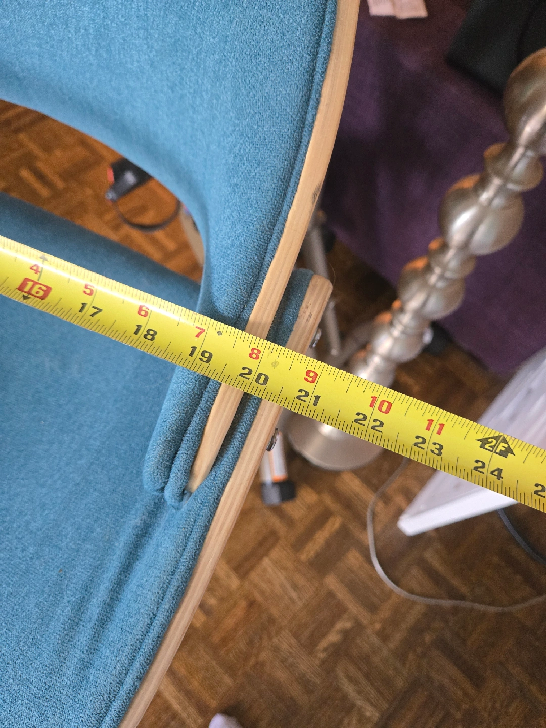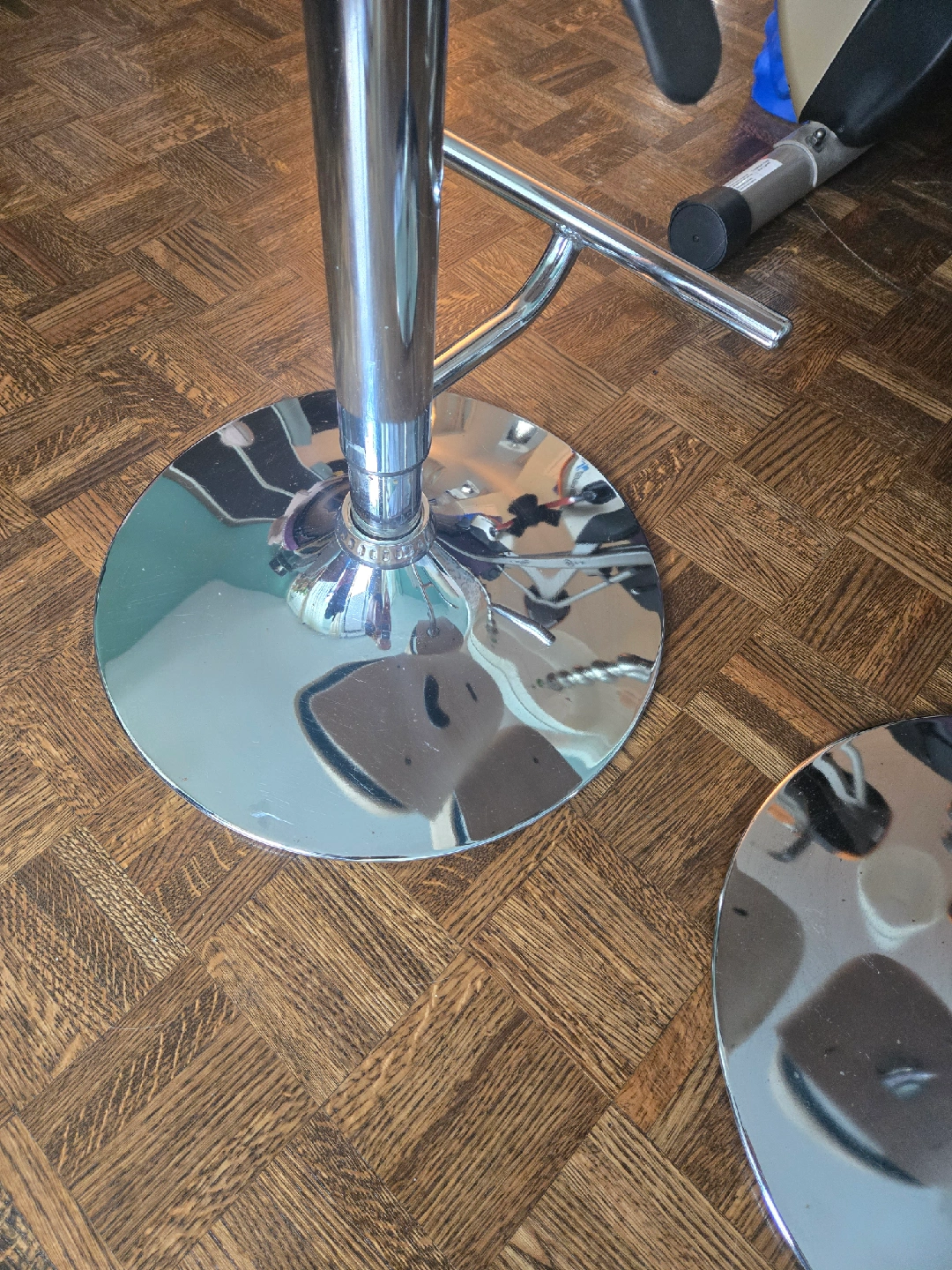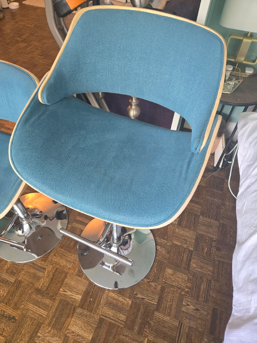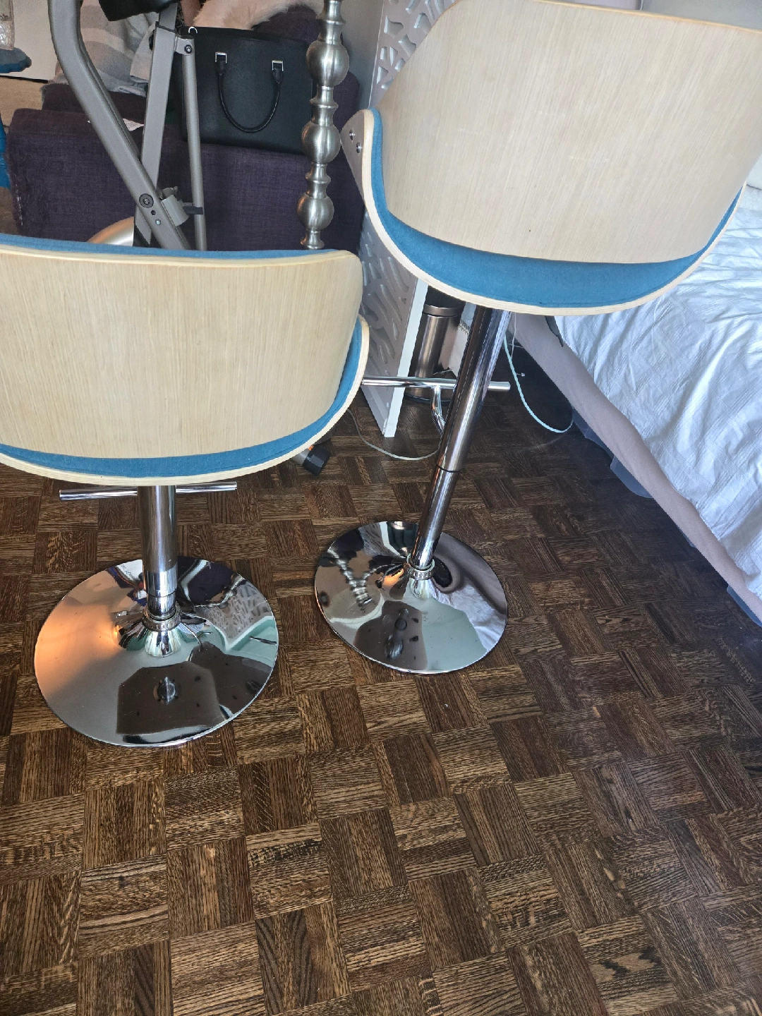 Selling a set of two adjustable height bar stools. They have a modern design with a chrome base and a comfortable seat. The seat is a nice teal colour with a wood trim. Great for a kitchen island or bar area! Gently used in a smoke free home. Measurements shown in the photos. Price is for the set!
