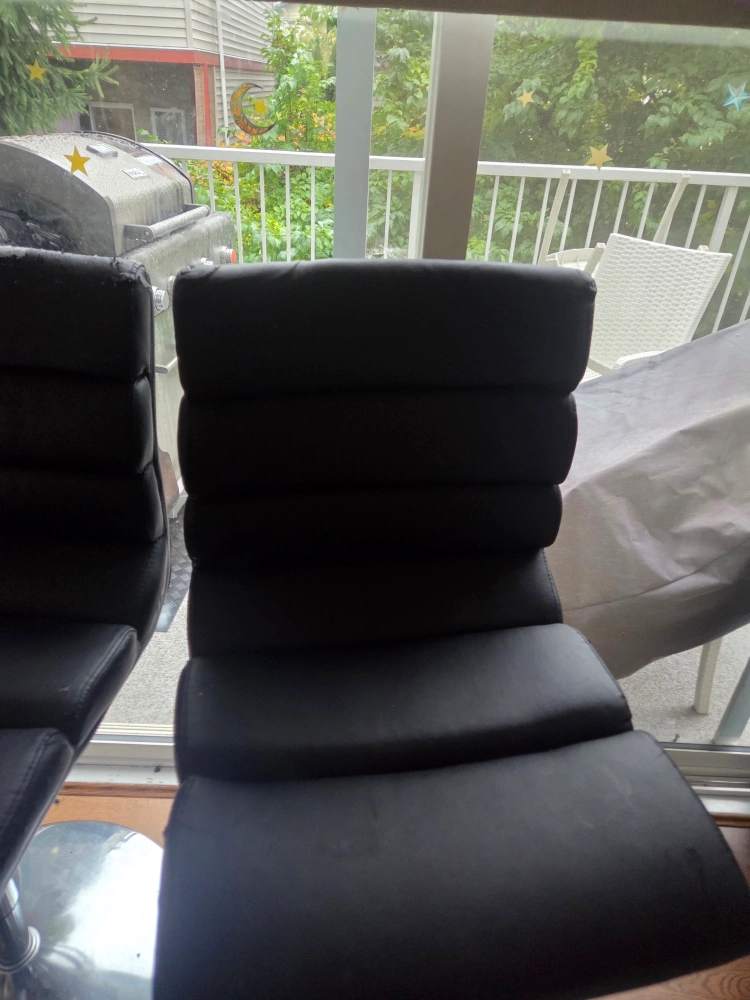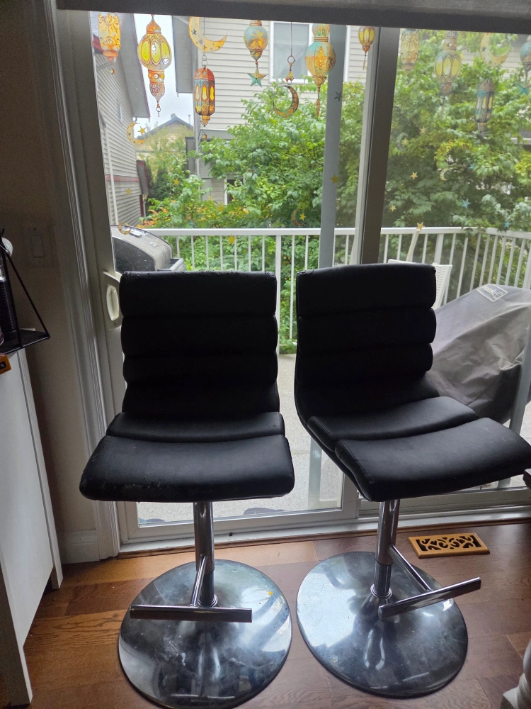 20Selling a set of two black bar stools. They swivel and have a chrome base. Please note that there are signs of wear and tear on the seats, as shown in the pictures. Still functional and would be great for a rec room or bar area!
