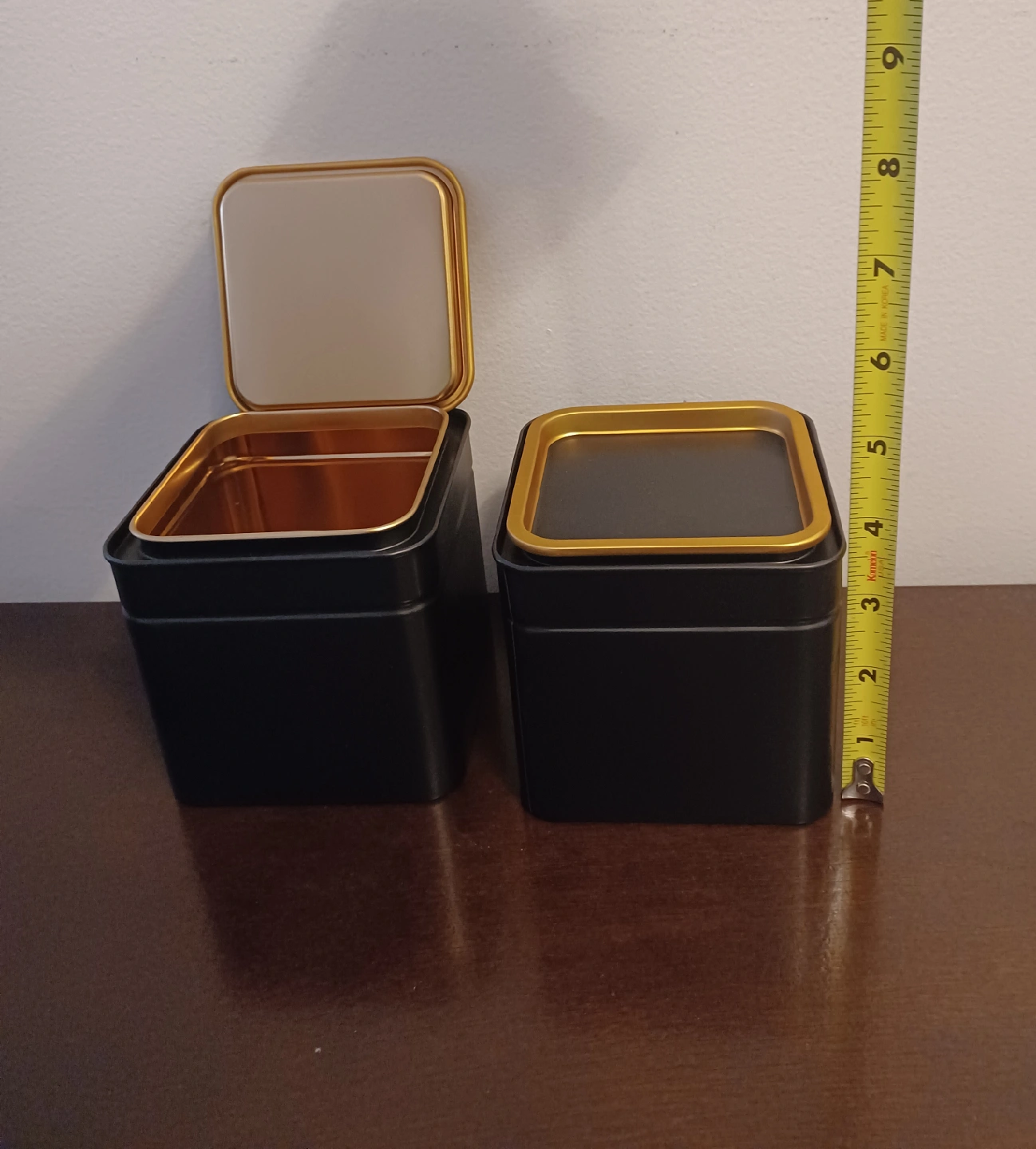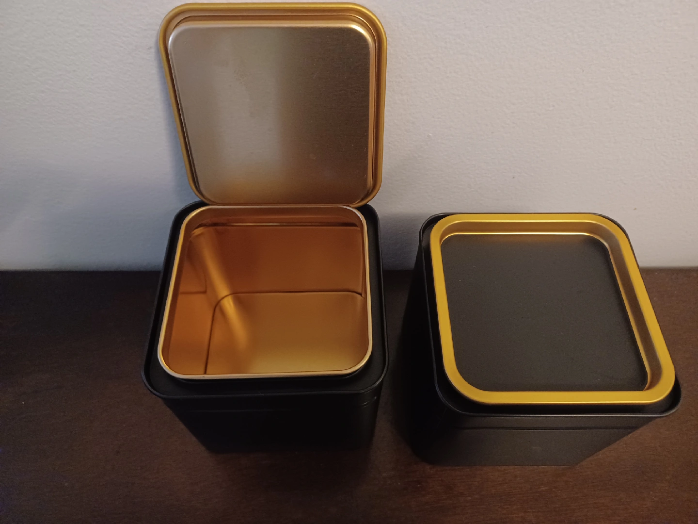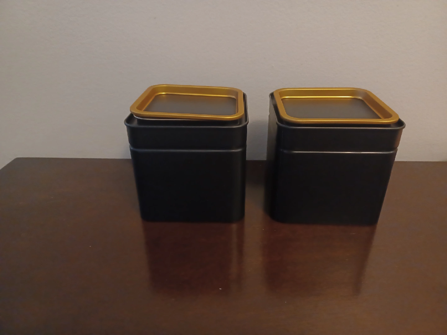 622Selling a set of two metal storage tins. They're black on the outside with a gold interior and trim. Great for storing tea, spices, or other small items around the house. Height: 4 inches