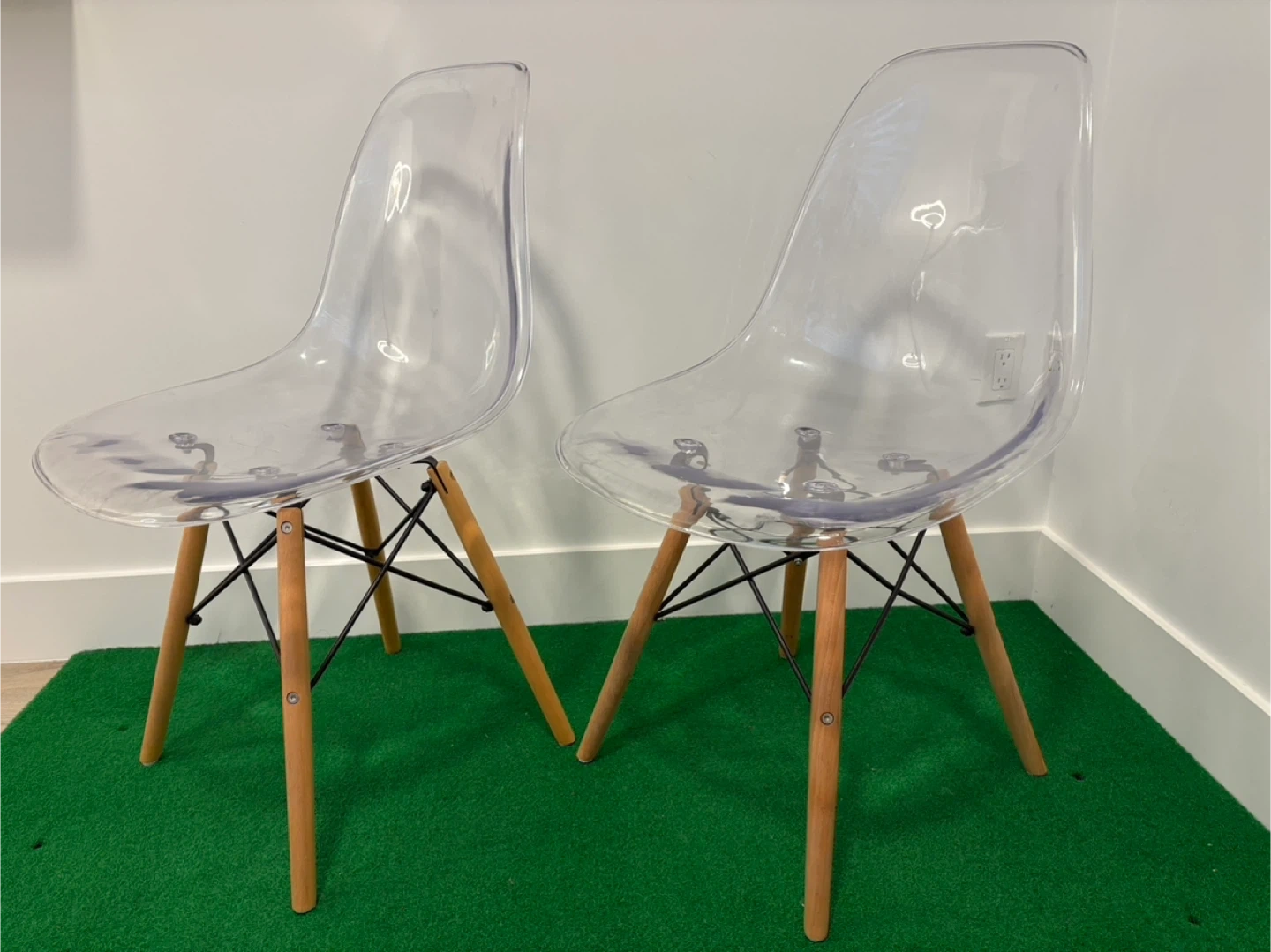 10Selling a set of two clear dining chairs. These chairs feature a modern design with wooden legs and a clear seat, perfect for adding a contemporary touch to your dining area or any room in your home. They are in good condition and ready for a new home.