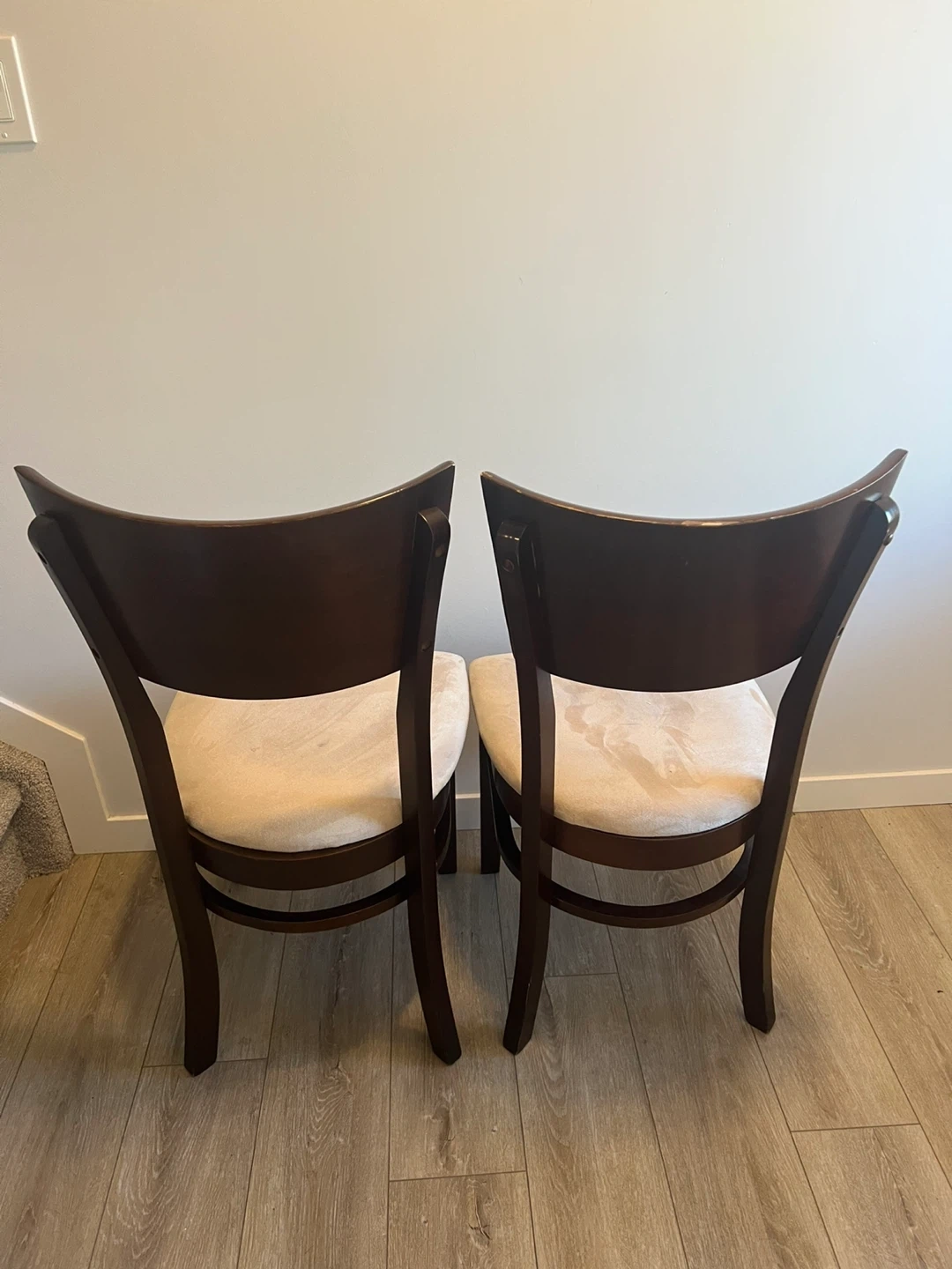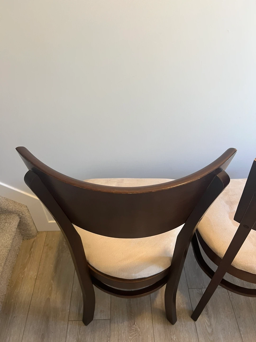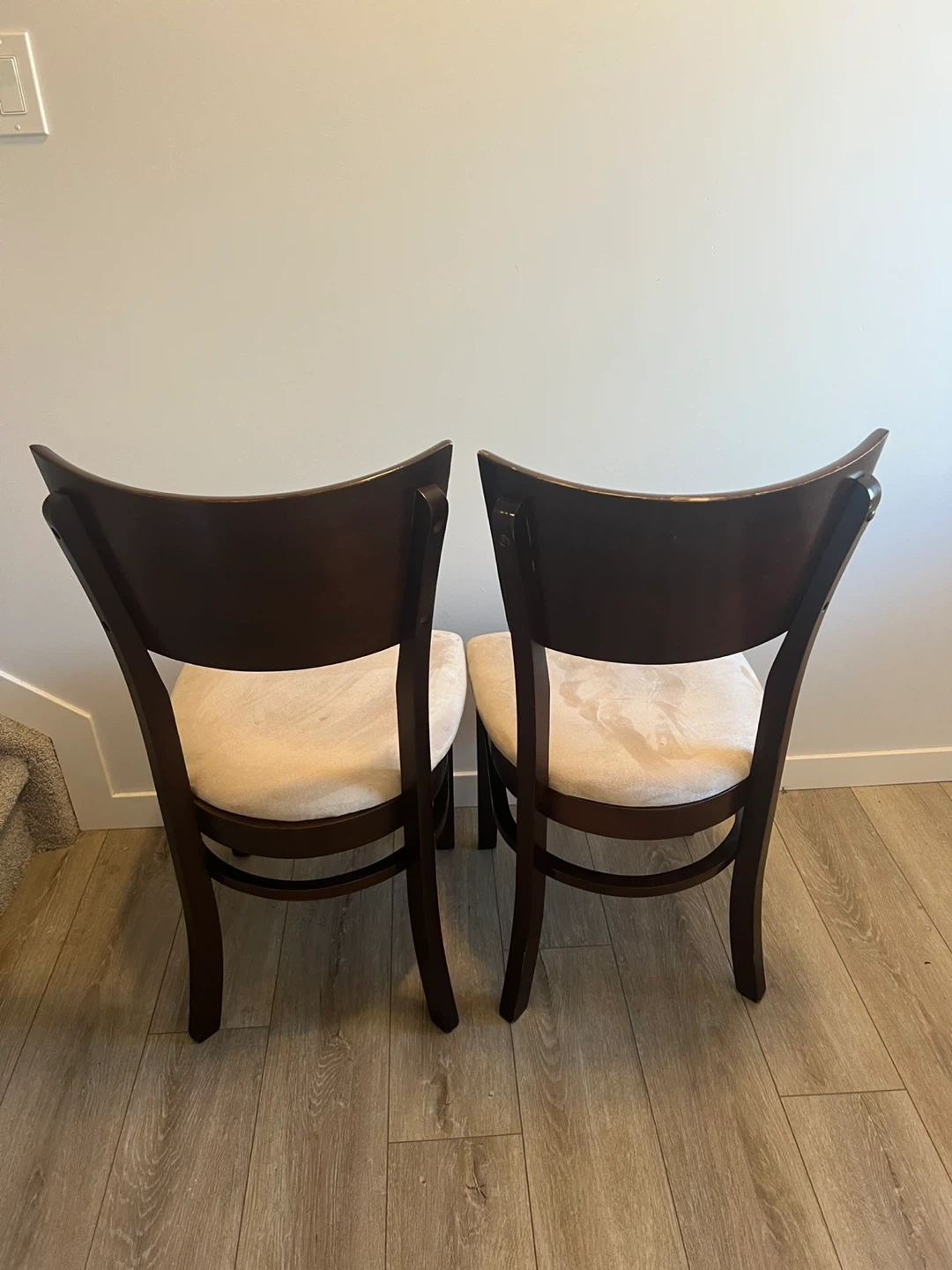 Selling a set of two dining chairs. They feature a dark wood frame and a light beige cushioned seat. Perfect for adding a touch of elegance to your dining space!