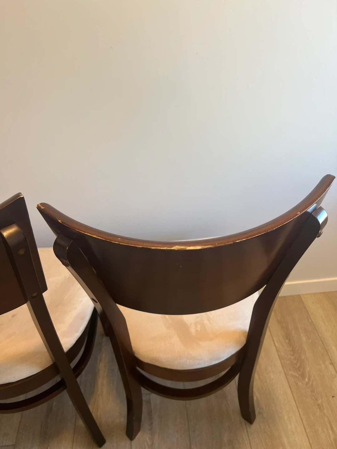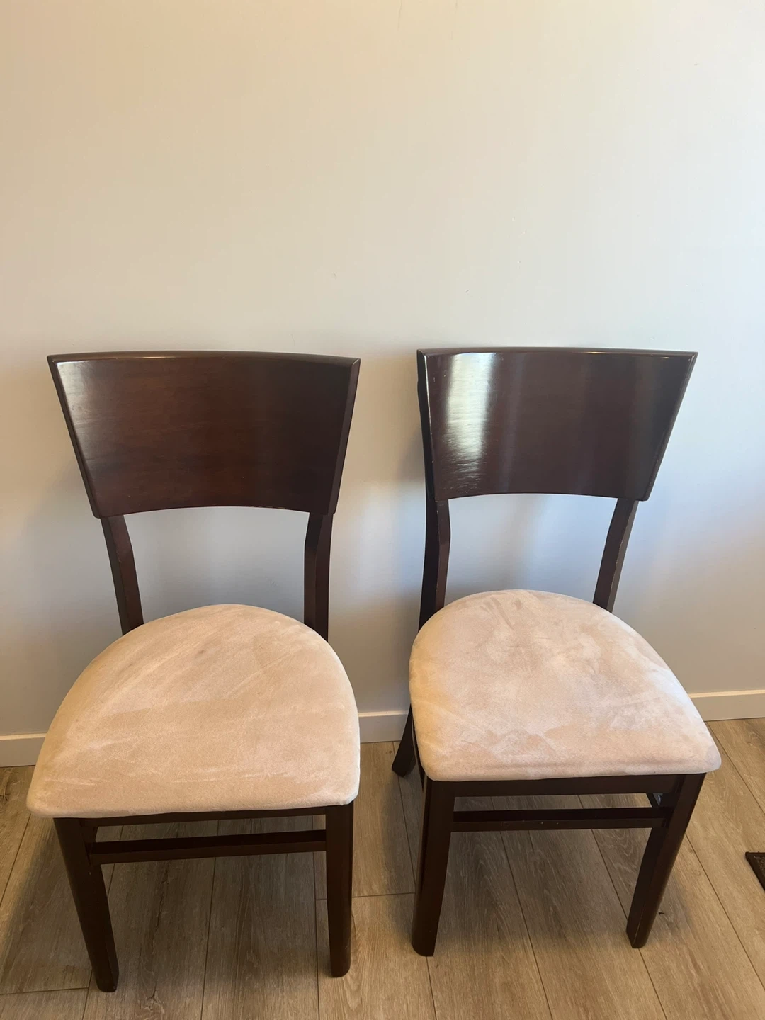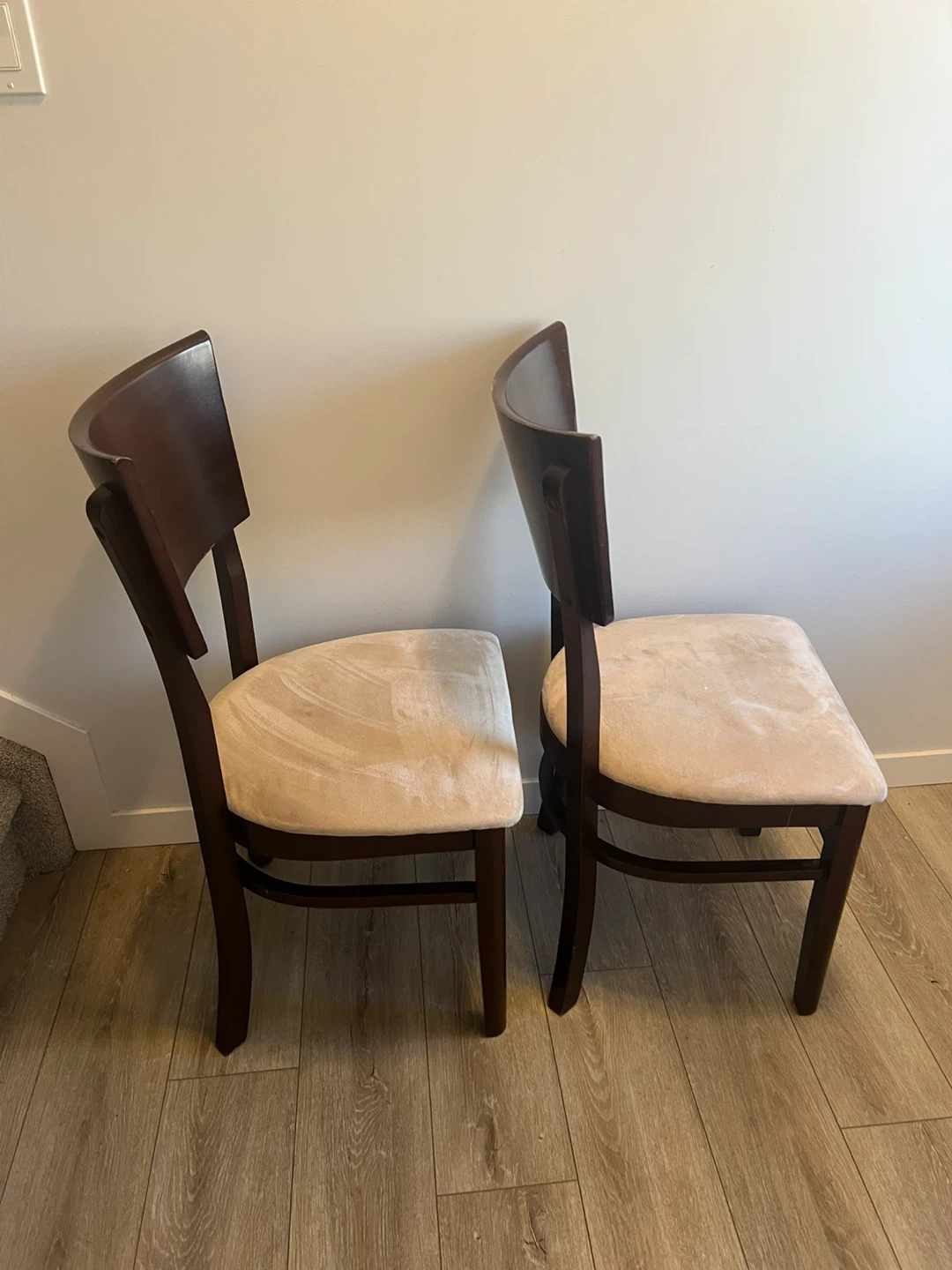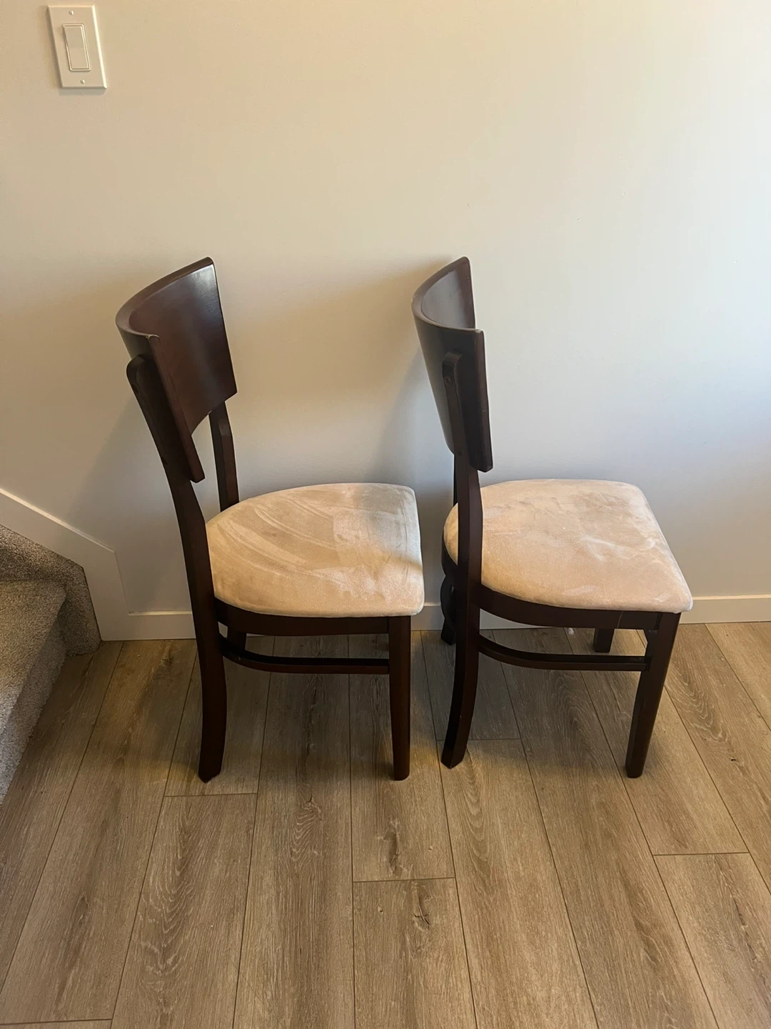 Selling a set of two dining chairs. They feature a dark wood frame and a light beige cushioned seat. Perfect for adding a touch of elegance to your dining space!