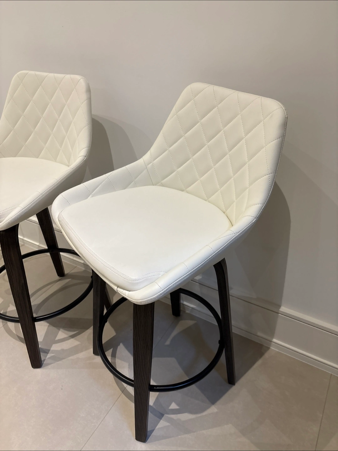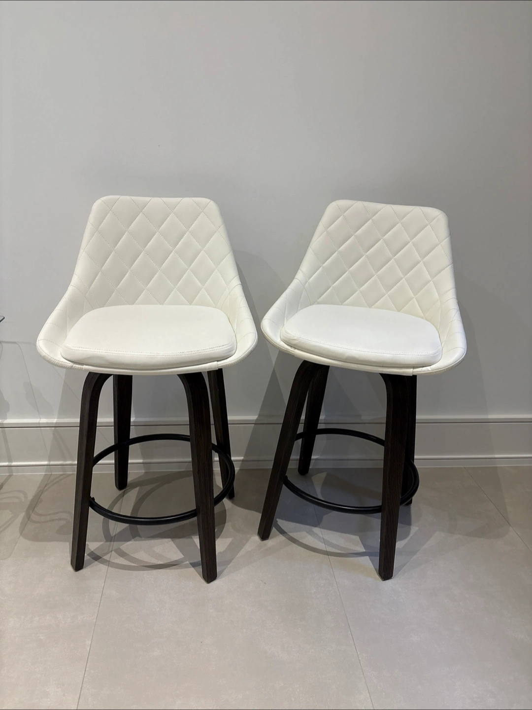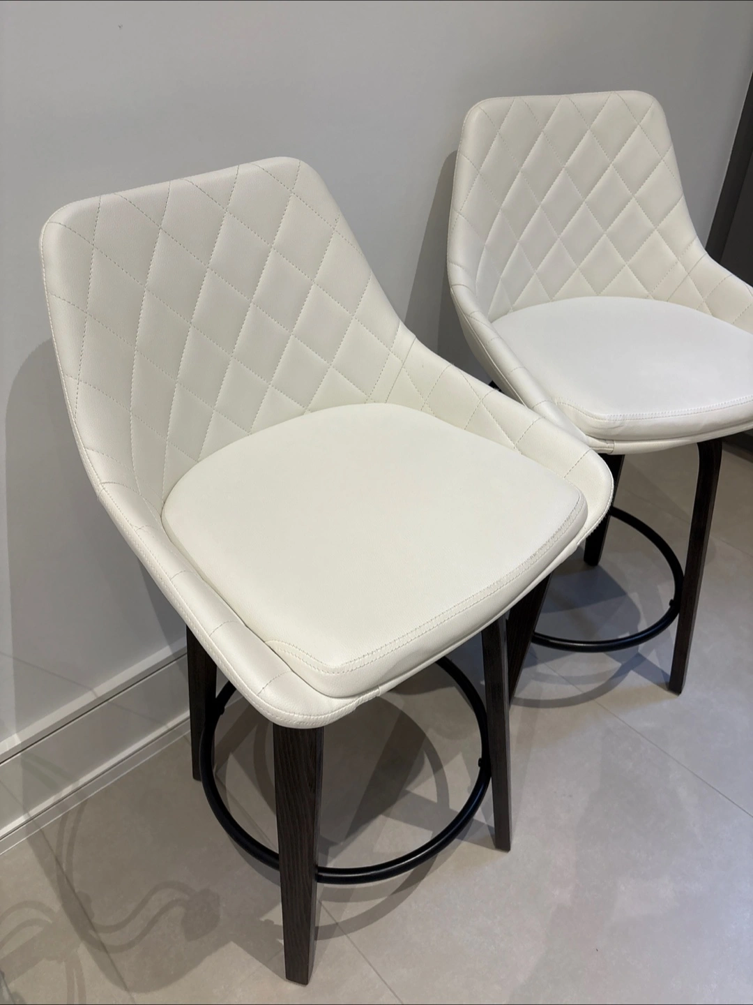 Selling a set of two bar stools. They feature a white faux leather seat with a quilted design and dark brown wooden legs. Height of seat: 65 cm Total height of chair: 93cm Length and width: 43 cm 200 each