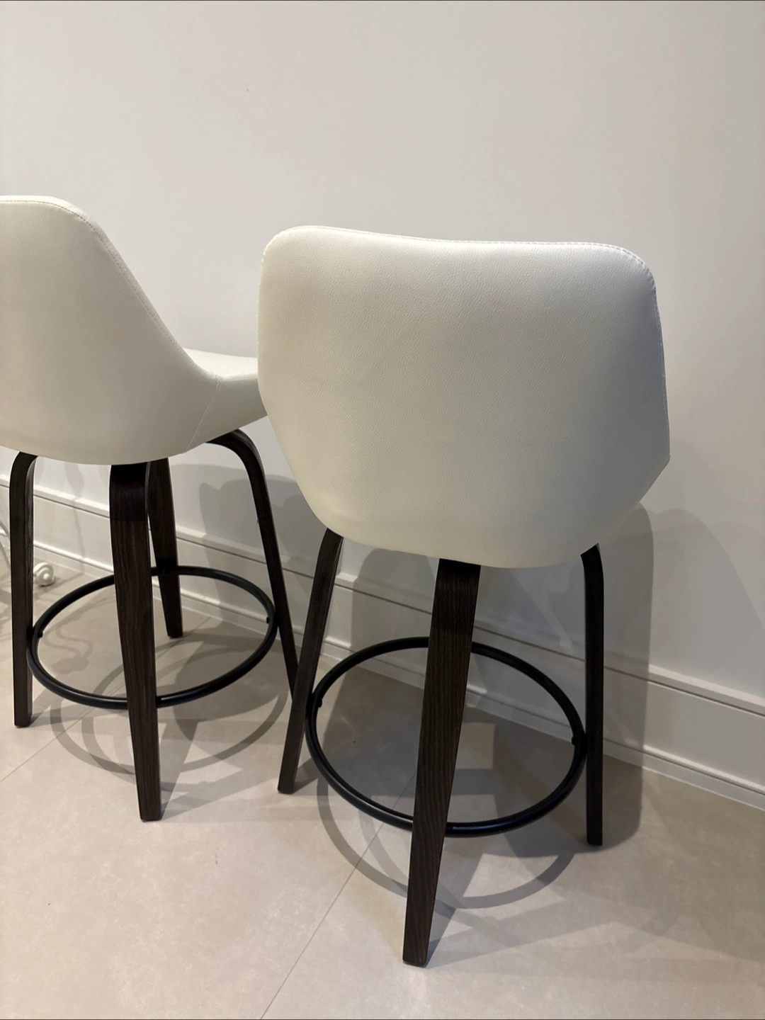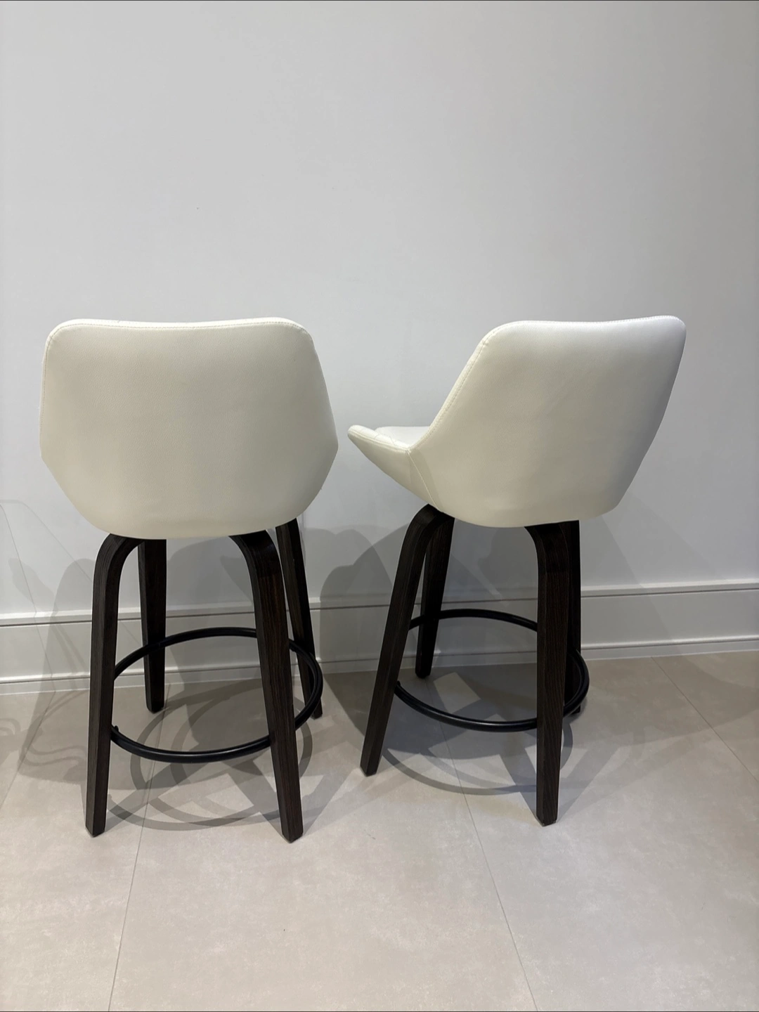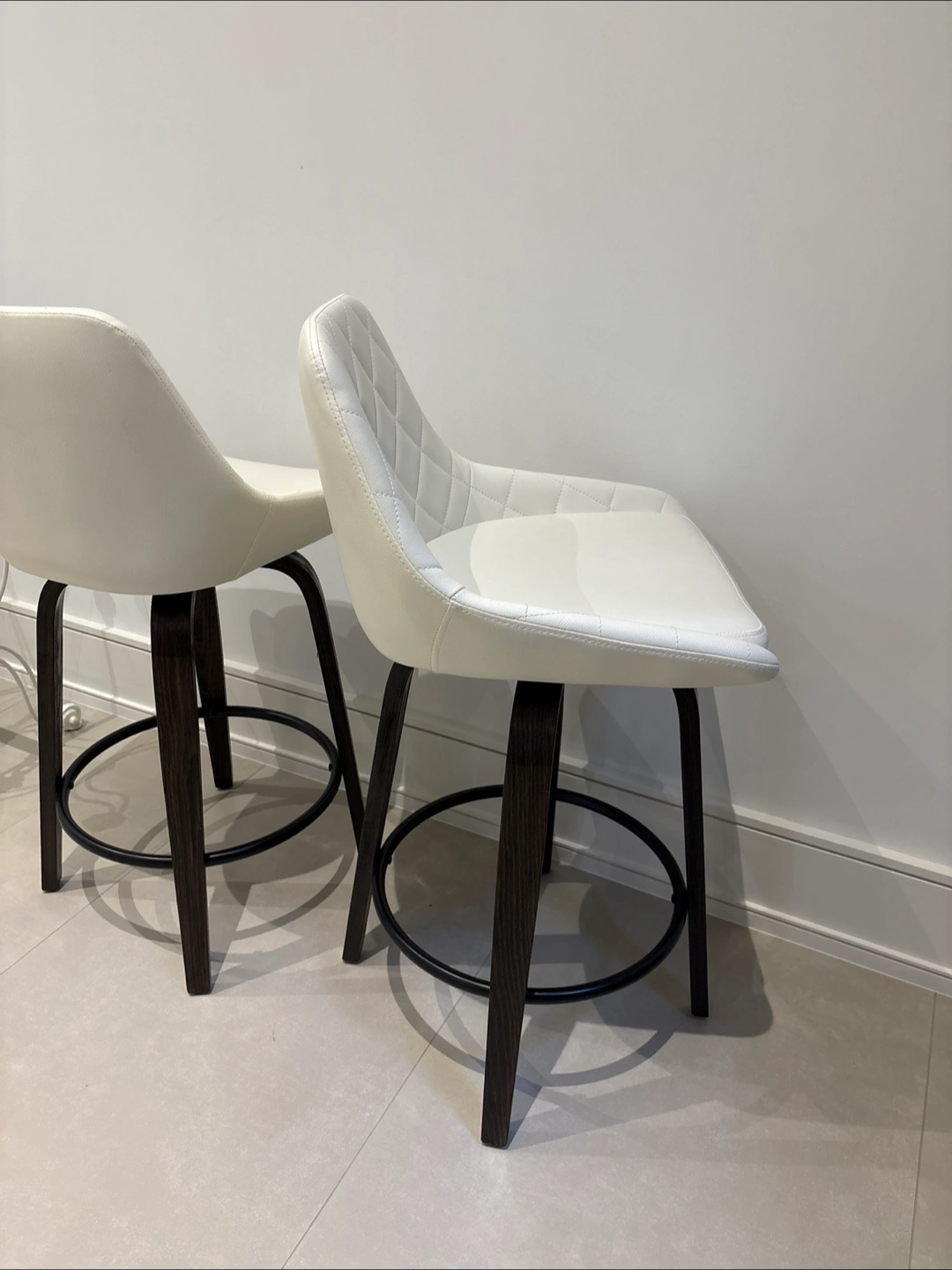 Selling a set of two bar stools. They feature a white faux leather seat with a quilted design and dark brown wooden legs. Height of seat: 65 cm Total height of chair: 93cm Length and width: 43 cm 200 each