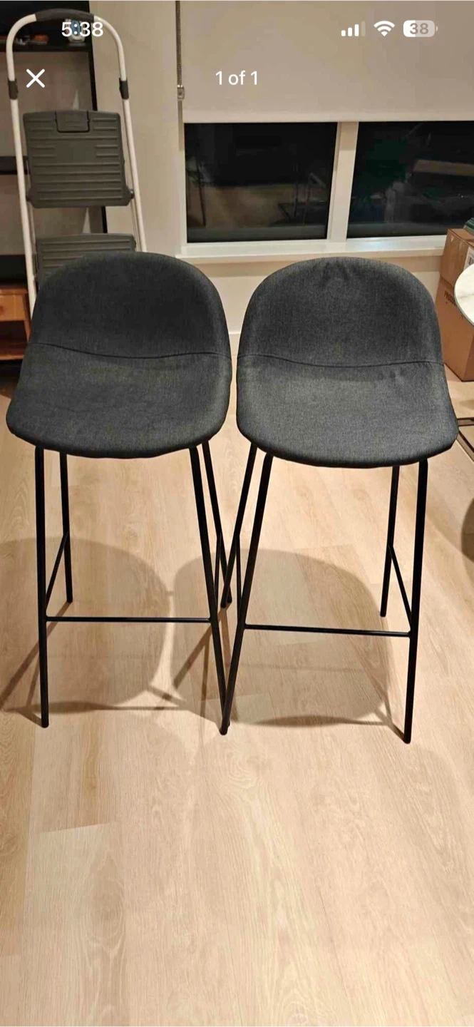 10Selling a set of two bar stools! They're in great condition and would look fantastic in any kitchen or bar area. The seats are a nice grey colour and the legs are black metal. They're sturdy and comfortable too!