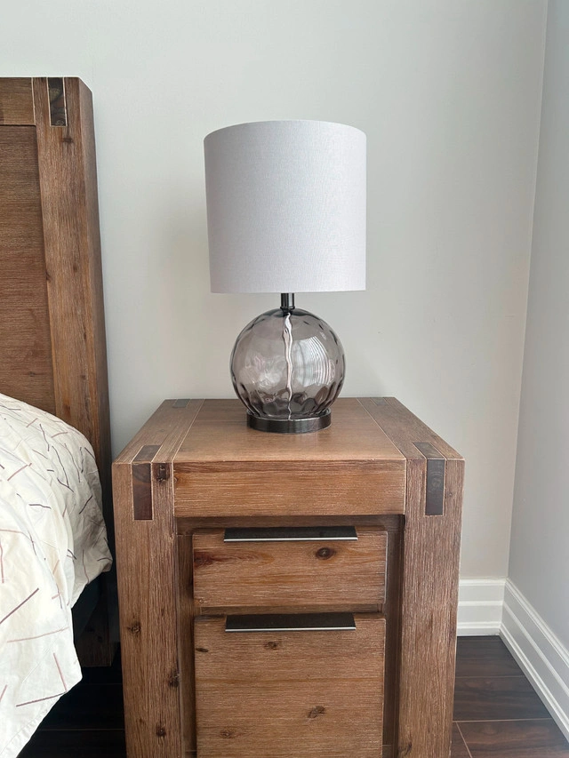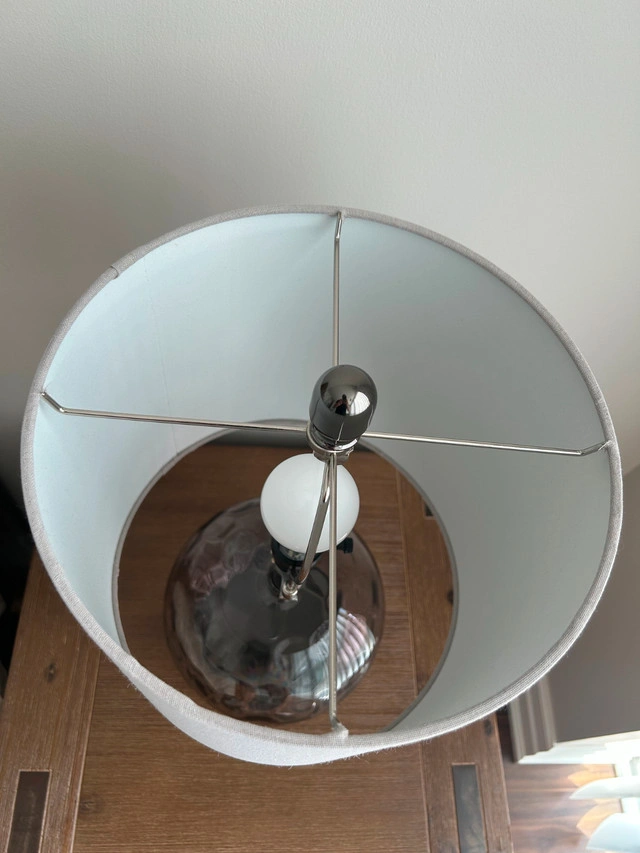 70Add a touch of modern elegance to your bedroom or living space with this beautiful matching pair of bedside table lamps. Each lamp features a sleek grey glass base that catches the light beautifully, paired with a classic fabric shade that gives off a warm, cozy glow. Perfect for nightstands, side tables, or as decorative accents in any room. Stylish, neutral, and ready to brighten your space! Dimensions: Height: 50.5 cm (20 in) Shade diameter: 28 cm (11 in) Base diameter: 16 cm (6.5 in) Condition: Excellent, lightly used Price: $60 for the pair