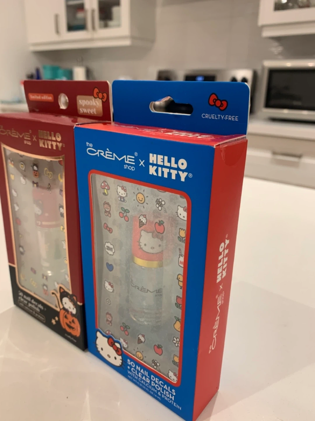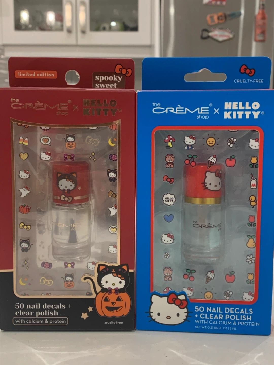 💙 Price is for both 🥹 The Crème Shop teams up with Hello Kitty to bring you these adorable nail decals and clear polish sets! 💙Each box contains 50 easy-to-apply nail decals infused with Calcium & Protein, plus a clear polish to help set and seal them in place. Perfect for a super cute manicure!