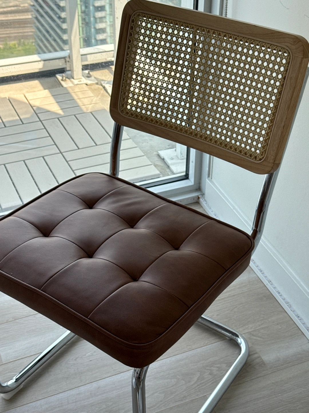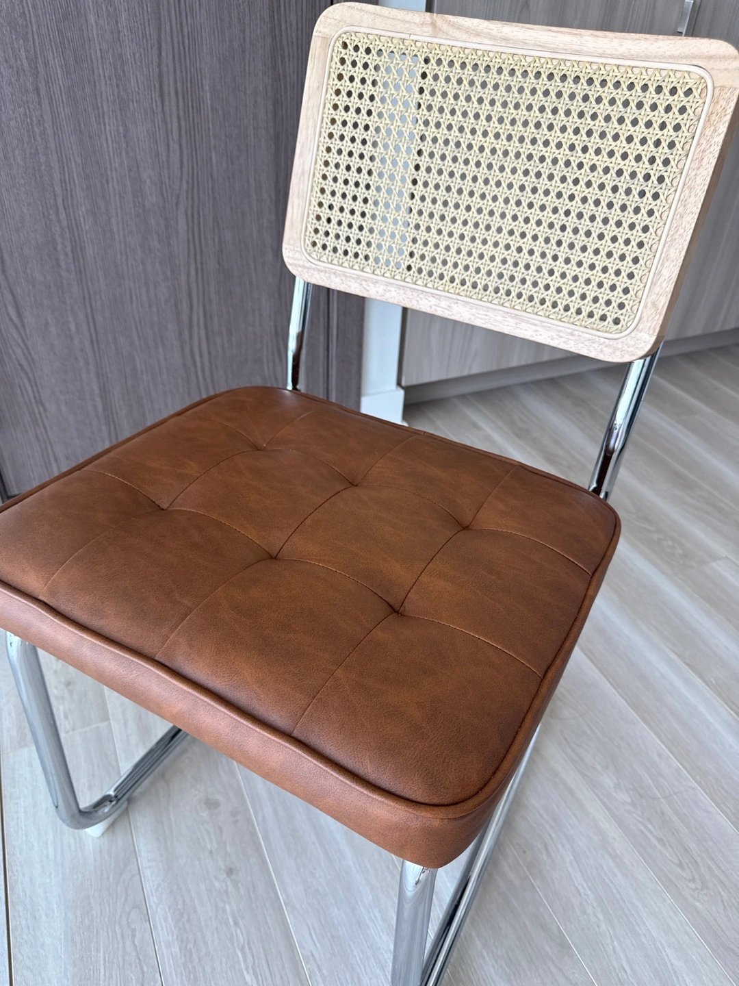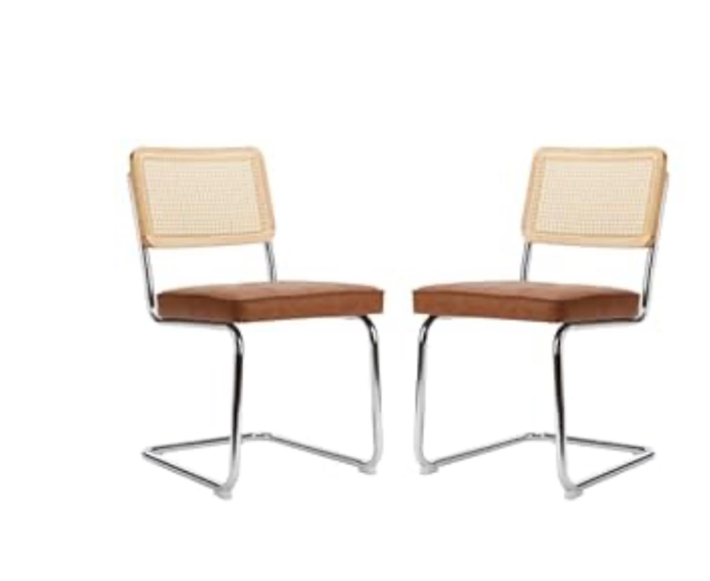A set of two dining chairs. Each chair features a brown, cushioned seat. Backrest includes a cane design, framed with wood(rattan). The legs are crafted from metal. But We have 4 chairs and can sell them separately in any quantity you need.