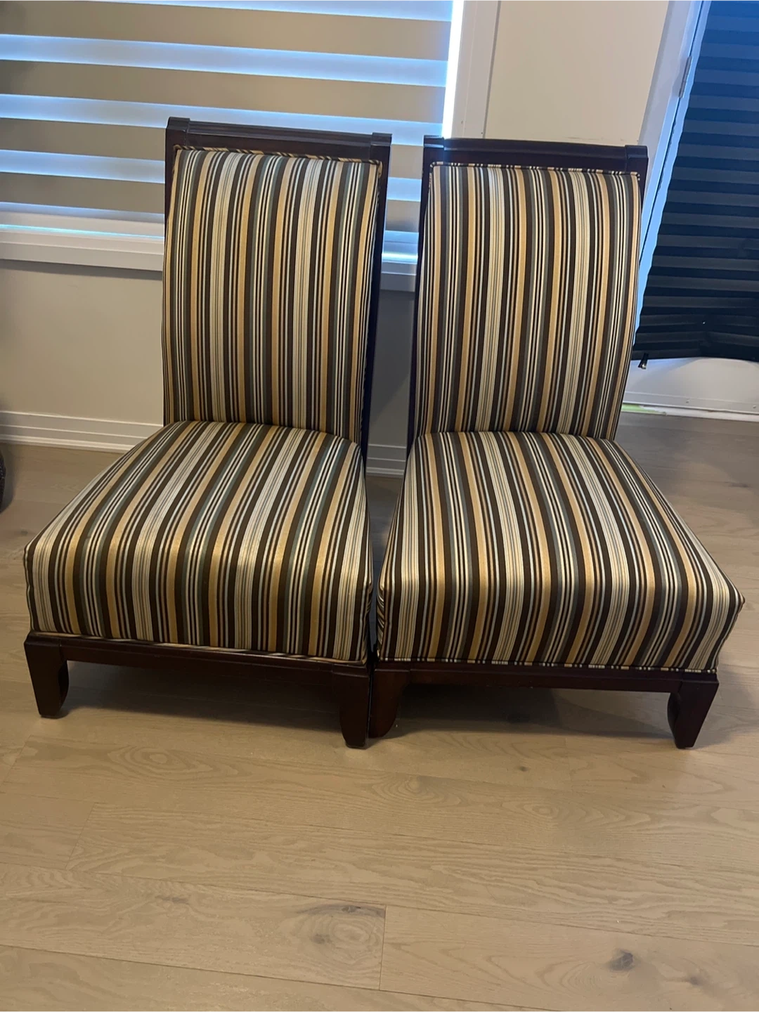 Selling set of two accent designer chairs! from Mobilia They feature a stylish striped pattern in brown, gold, and white. They're in great condition and would make a lovely addition to any room