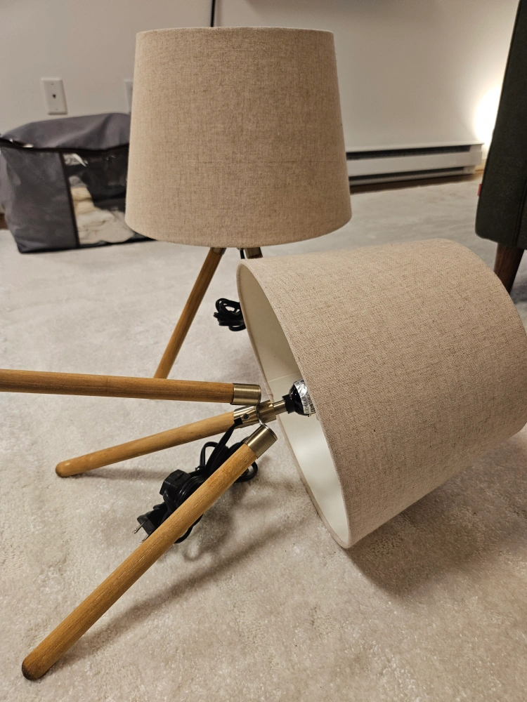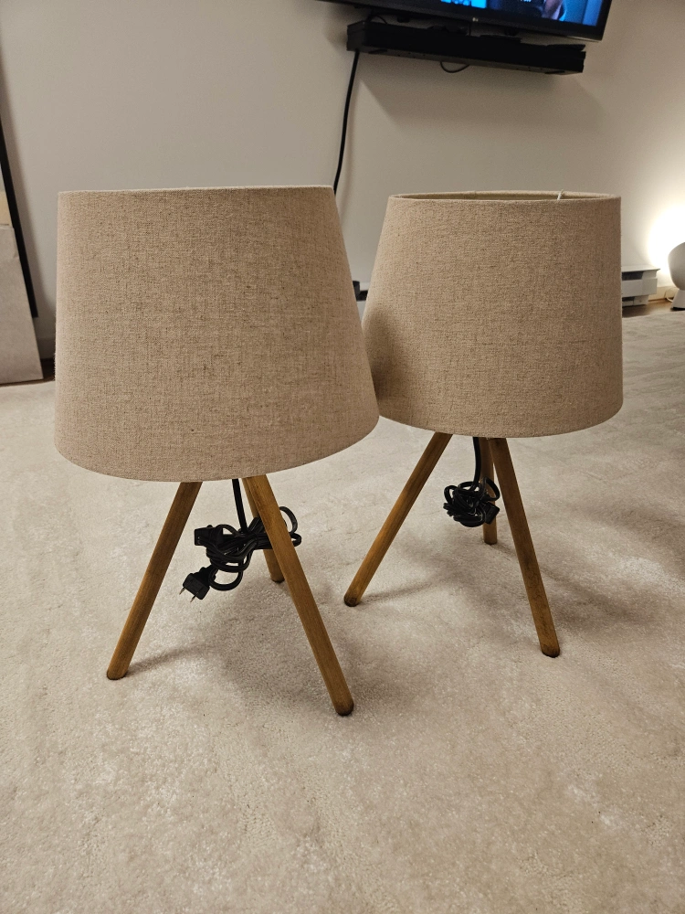 12Set of 2 table lamps with linen shades and wooden tripod bases. Includes 2 energy efficient LED lightbulbs (3000K colour temp).