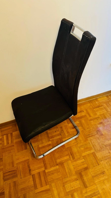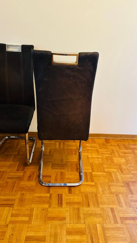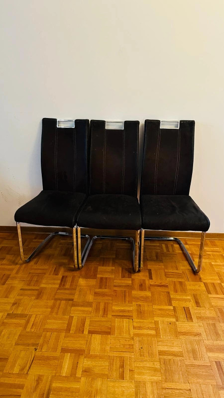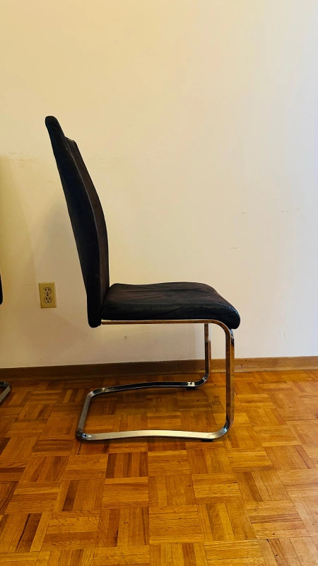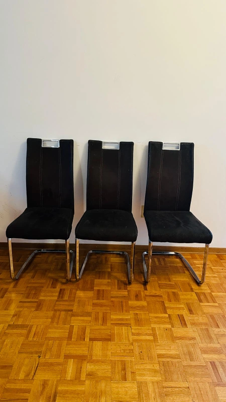 24Selling a set of three dining chairs. They're in great shape and have a sleek, modern look with a black finish and chrome legs. Perfect for updating your dining space! You can get 1/3---2/3---3/3.