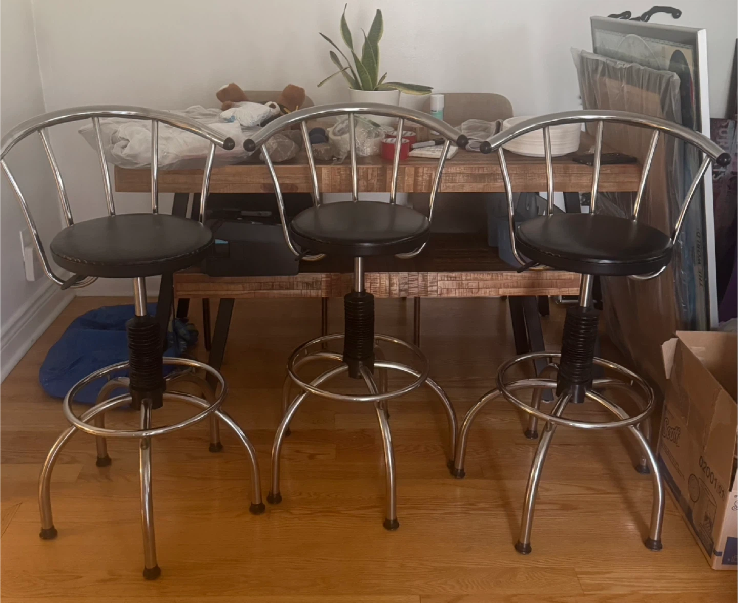 Selling a set of three bar stools! They feature a chrome frame with a black seat. The height is adjustable, making them perfect for any counter or bar area. They're in great shape and ready for a new home