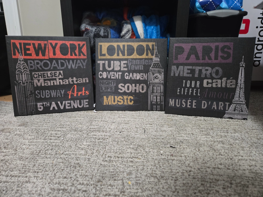 63Selling a set of three canvas wall art pieces featuring iconic cities! Each canvas showcases a different city: New York, London, and Paris. Perfect for adding a touch of urban flair to your home decor. Price is for all three.