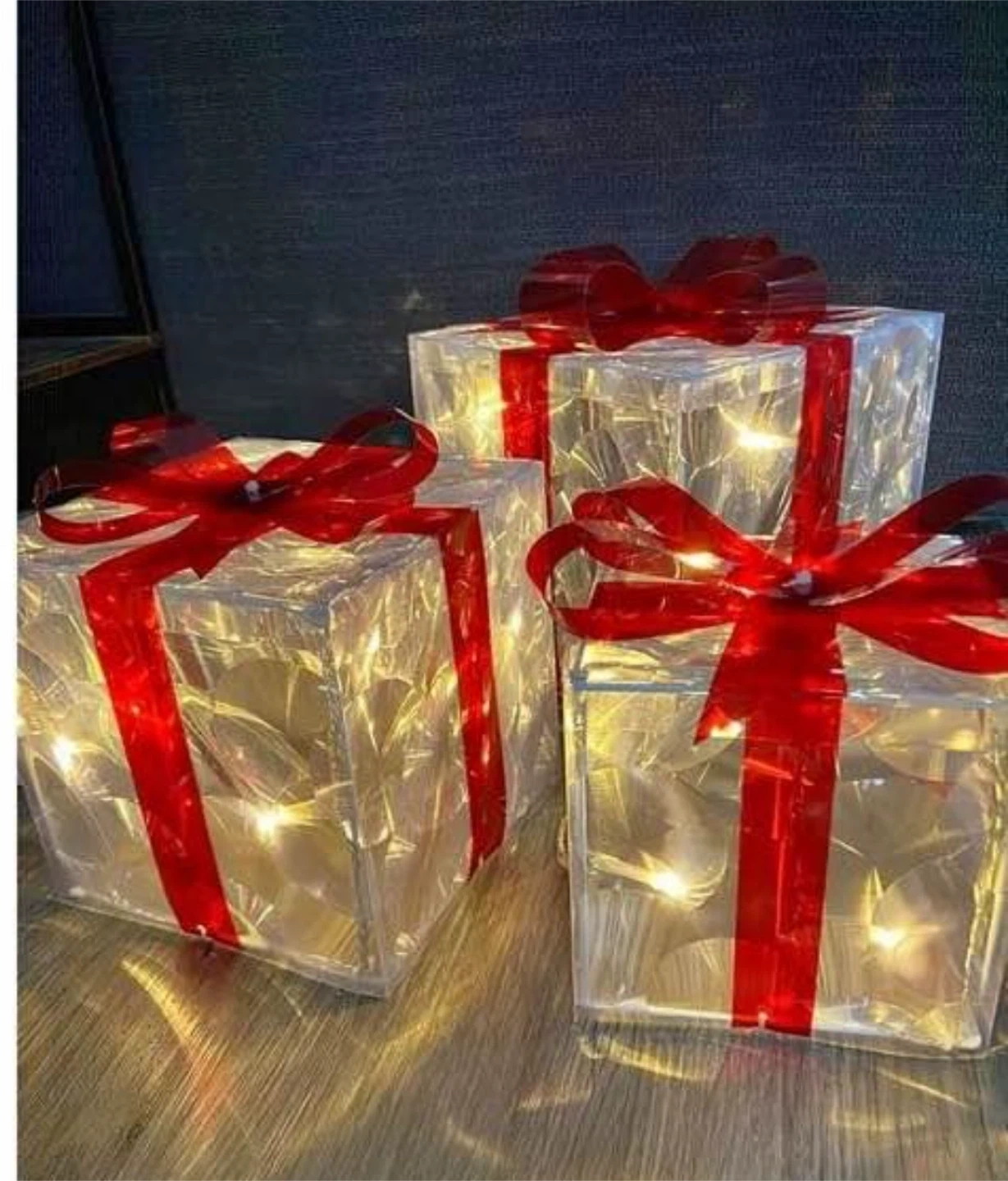 113Set of 3 new decorative lighted gift boxes, each adorned with a festive red ribbon! The dimensions are approximately 19cm/7.48in, 18cm/7.09in, and 13cm/5.12in, perfect for decorating your home indoor or outdoor..pick up on Chandos Drive in Chicopee area of south Kitchener N2A4H8