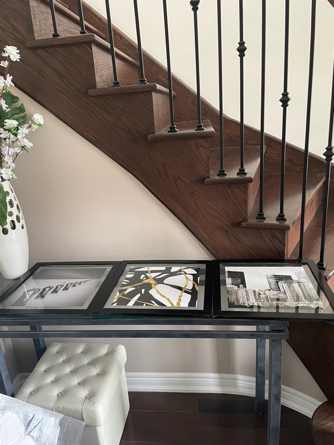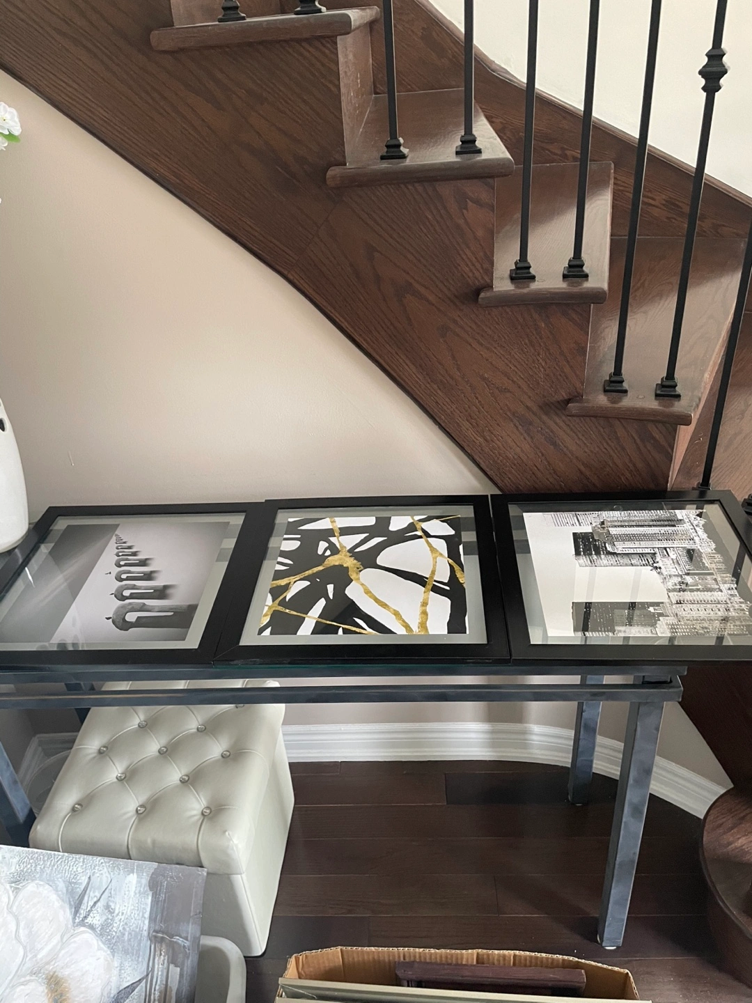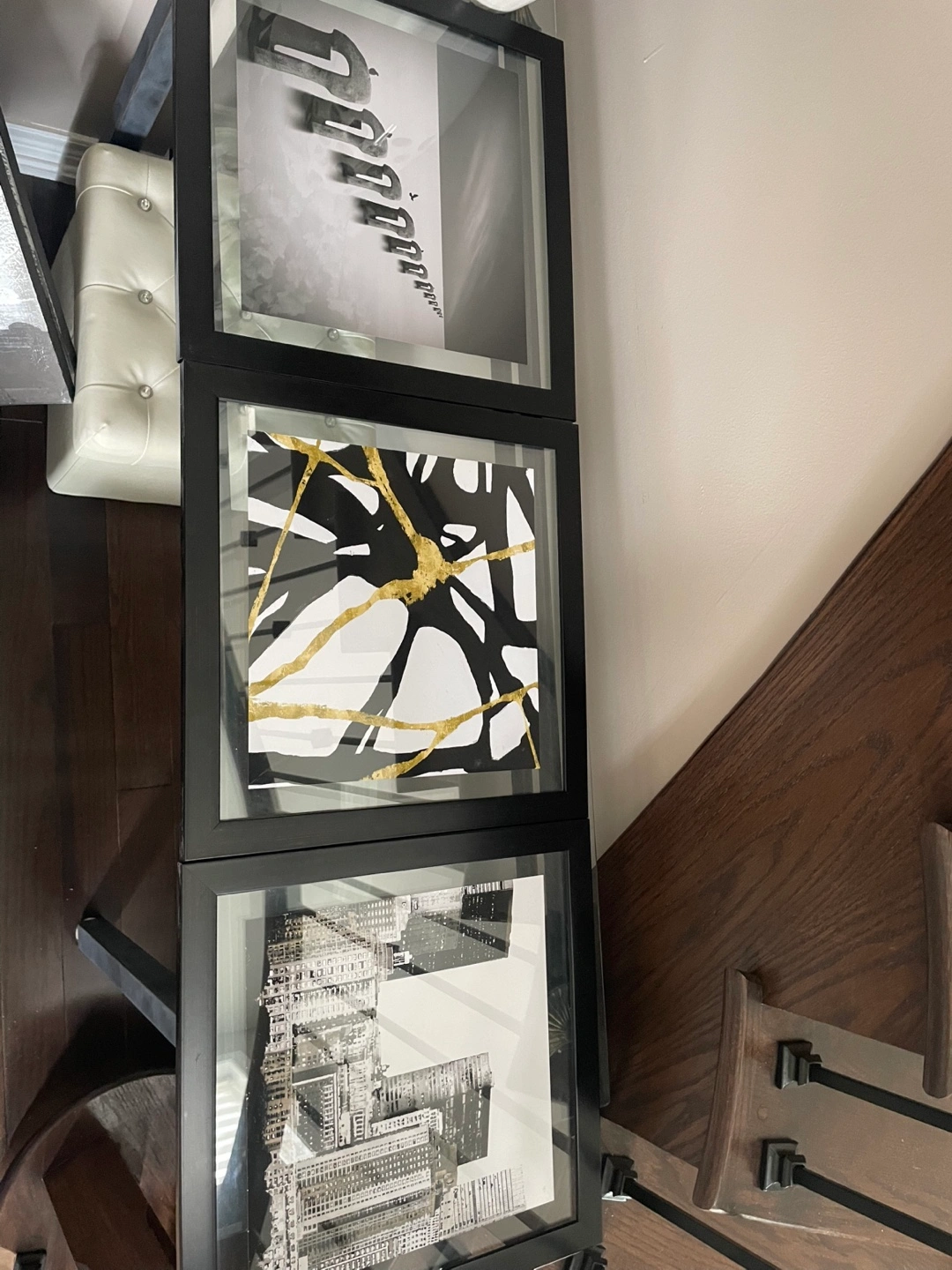 Selling a set of three framed wall art pieces! They're in great condition and would look lovely in any home. They feature modern designs in black and white with gold accents.
