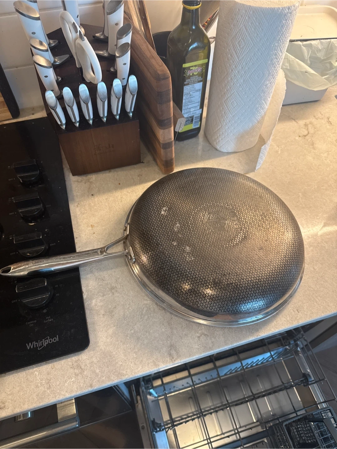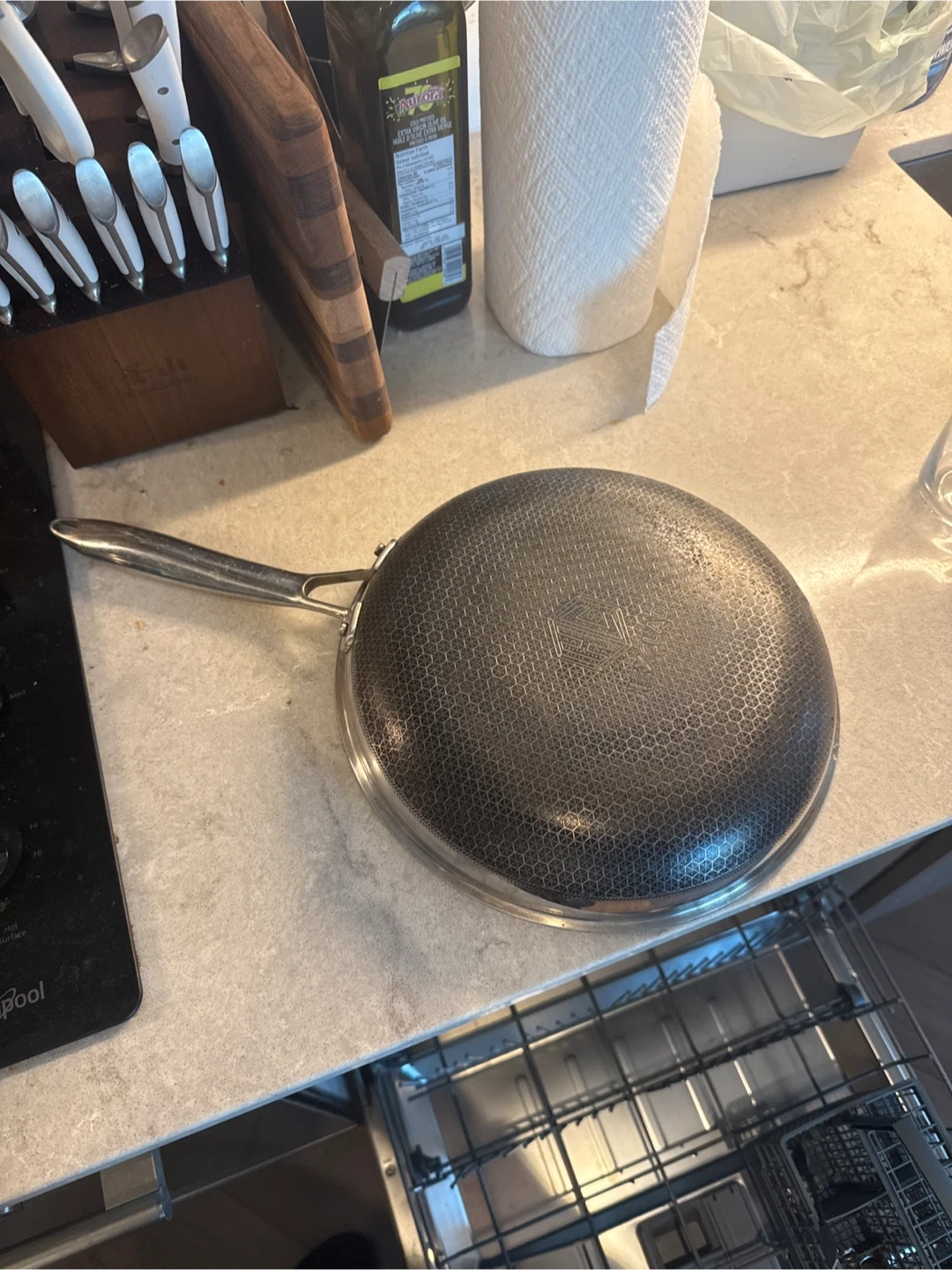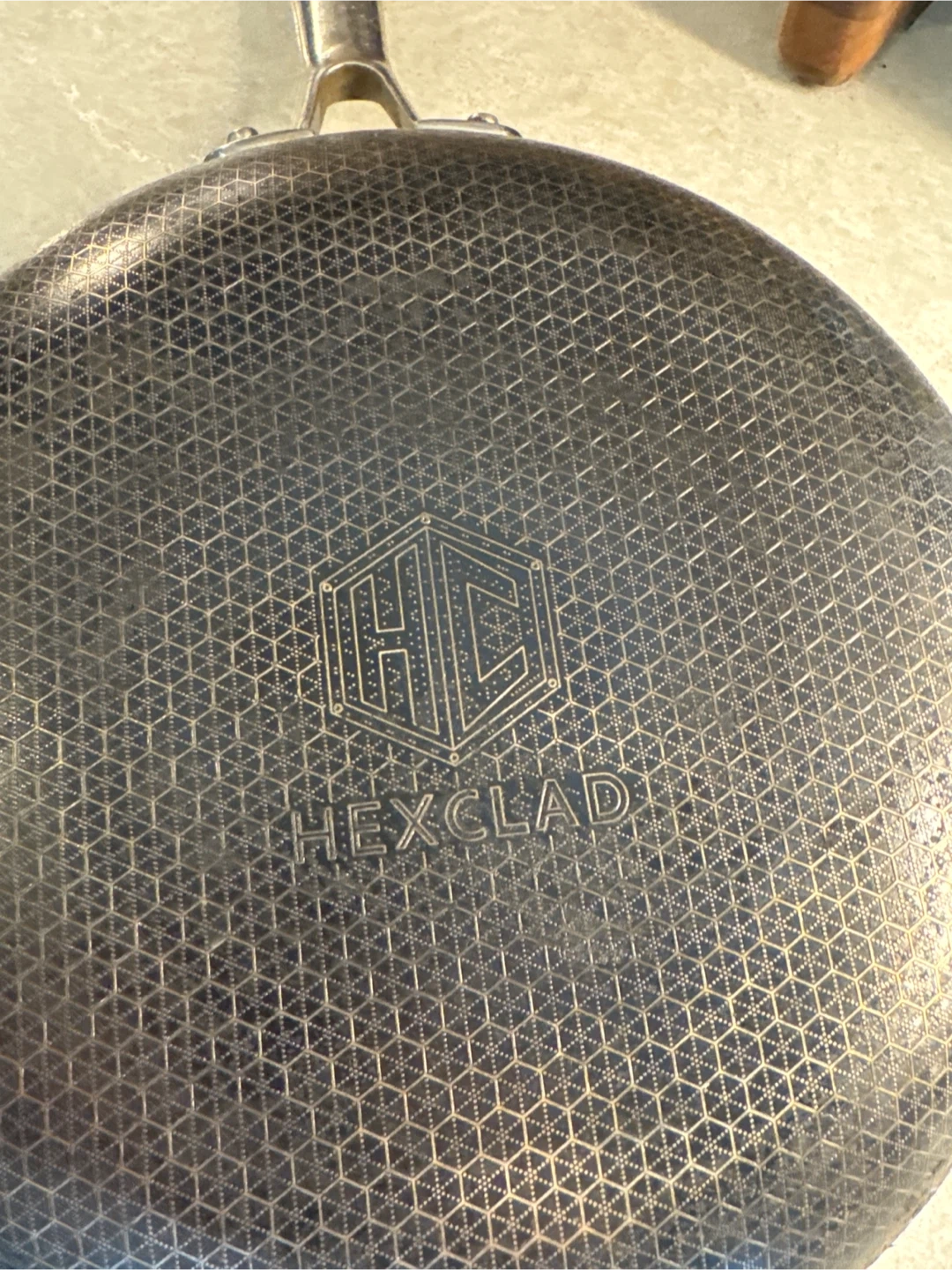 77Set of 3 original hexclad stainless steel /non-stick lined cookware. Includes: - 12.5”flat bottom wok - 12.5” frying pan - 10.5” frying pan These have been well used and have started to stick when cooking, but are hefty pans that retain heat well. Selling as a set only as I’ve switched to new cookware and want to get rid of them.