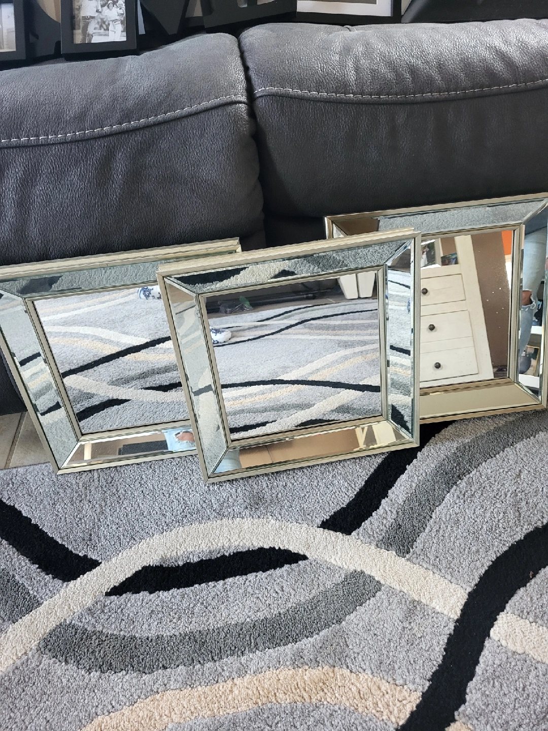 Selling a set of three framed mirrors, perfect for adding a touch of elegance to any room! They have a mirrored frame that reflects light beautifully. These are in great condition and ready to be hung!