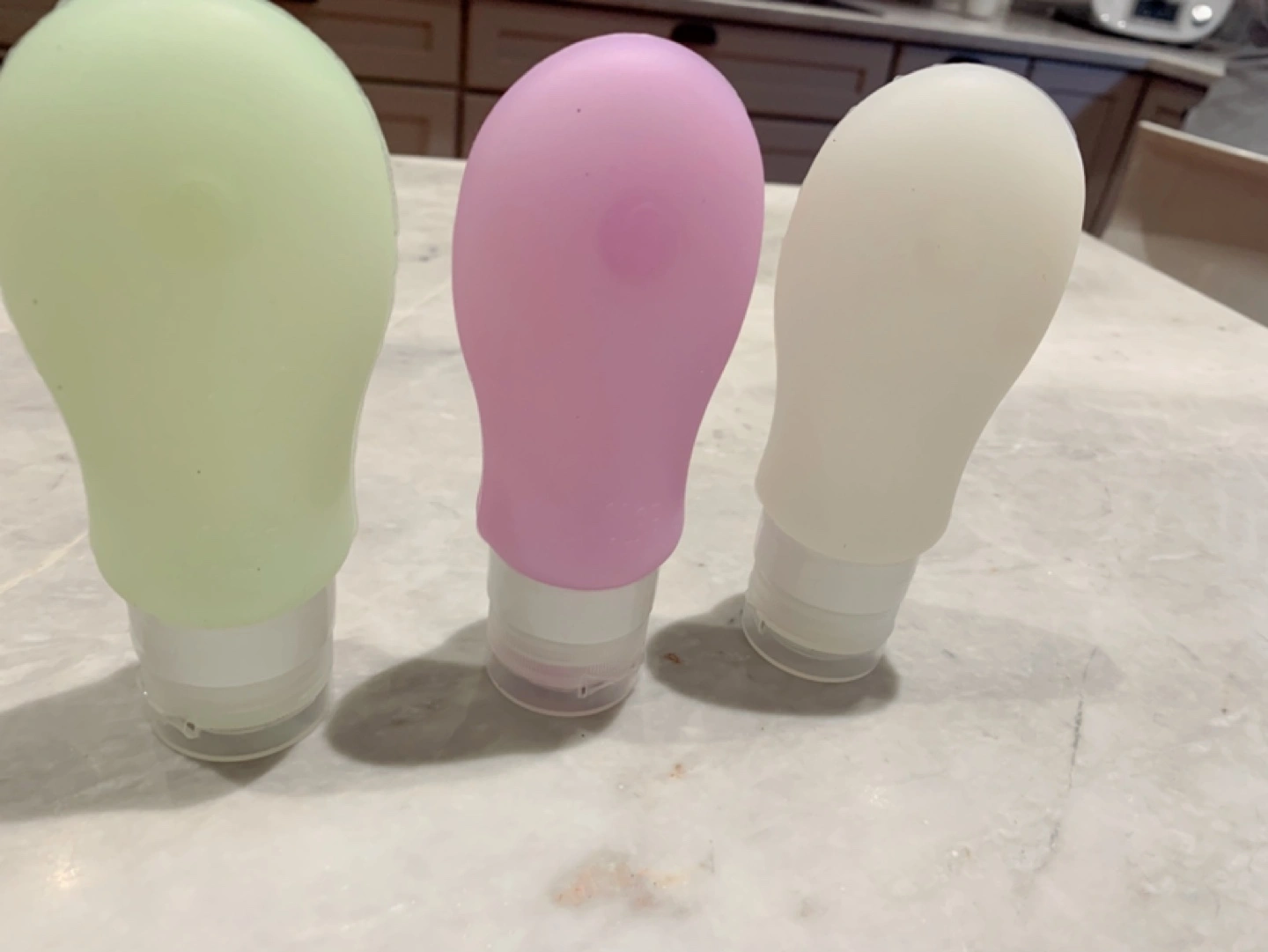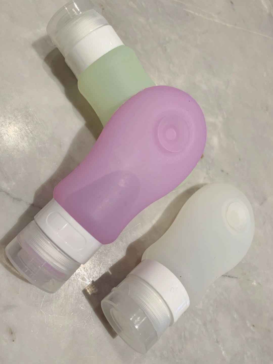 Set of 3 Silicone Travel Bottles – Reusable & Squeezable Selling a set of three travel-sized silicone bottles. • Material: Soft, squeezable silicone • Colors: Green, pink, white • Size: Approximately 10 cm (4 inches) tall • Features: • Leak-proof design • Refillable and reusable • TSA-approved travel size • Easy to squeeze and clean Perfect for carrying shampoo, lotion, or other liquids while traveling.