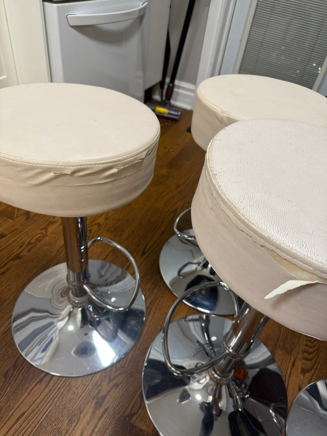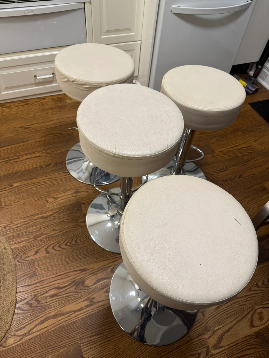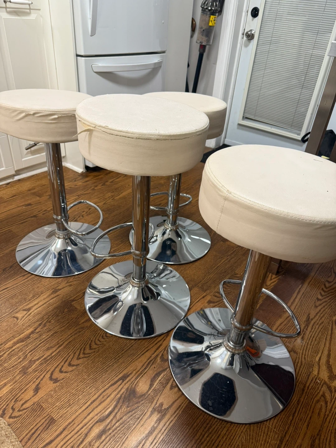 Selling a set of four bar stools. They have a chrome base and cream-coloured seats. They're perfect for a kitchen island or bar area. Please note that the seats show some signs of wear, as seen in the photos