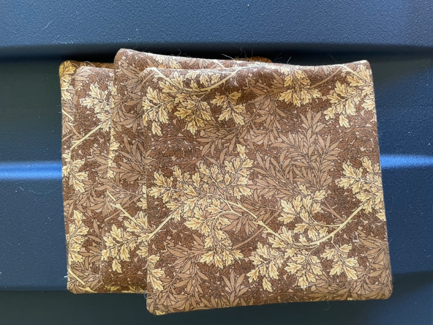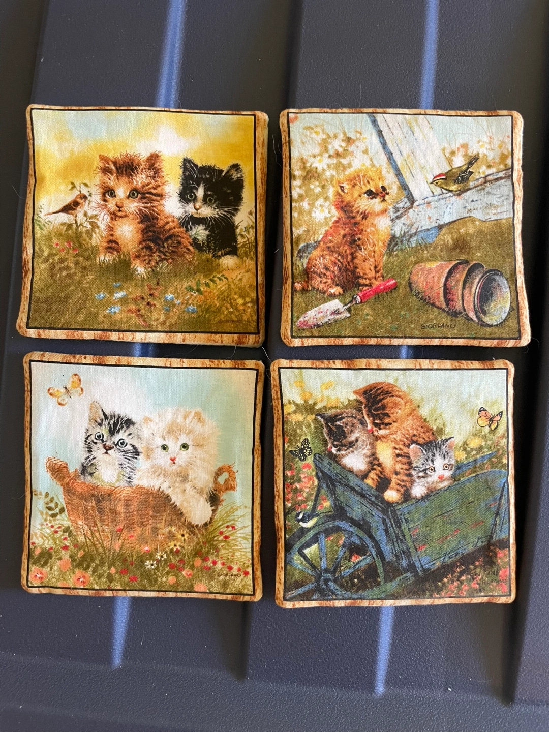 10Here's a set of four cute coasters featuring different cat prints! They have a brown leaf pattern on the back. Perfect for protecting your surfaces with a touch of feline charm.