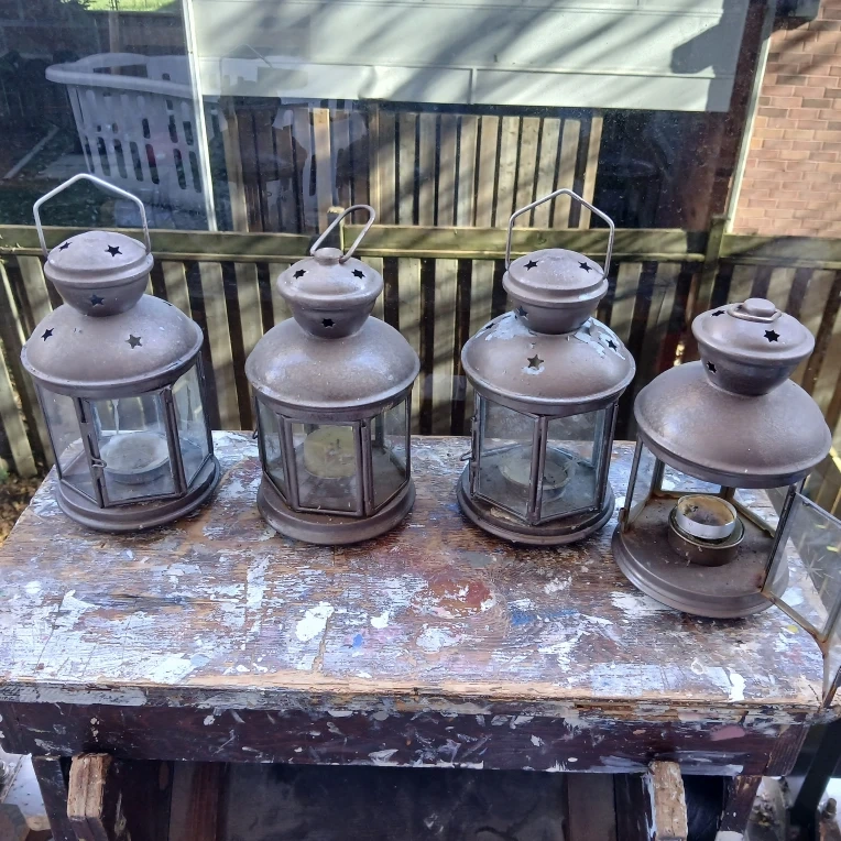 45Selling a set of four decorative metal lanterns! They add a cozy touch to any space, whether it's indoors or outdoors. Perfect for creating a warm and inviting atmosphere on your patio or in your living room