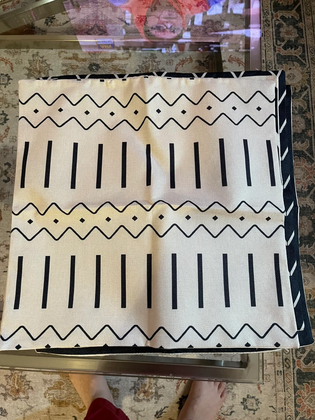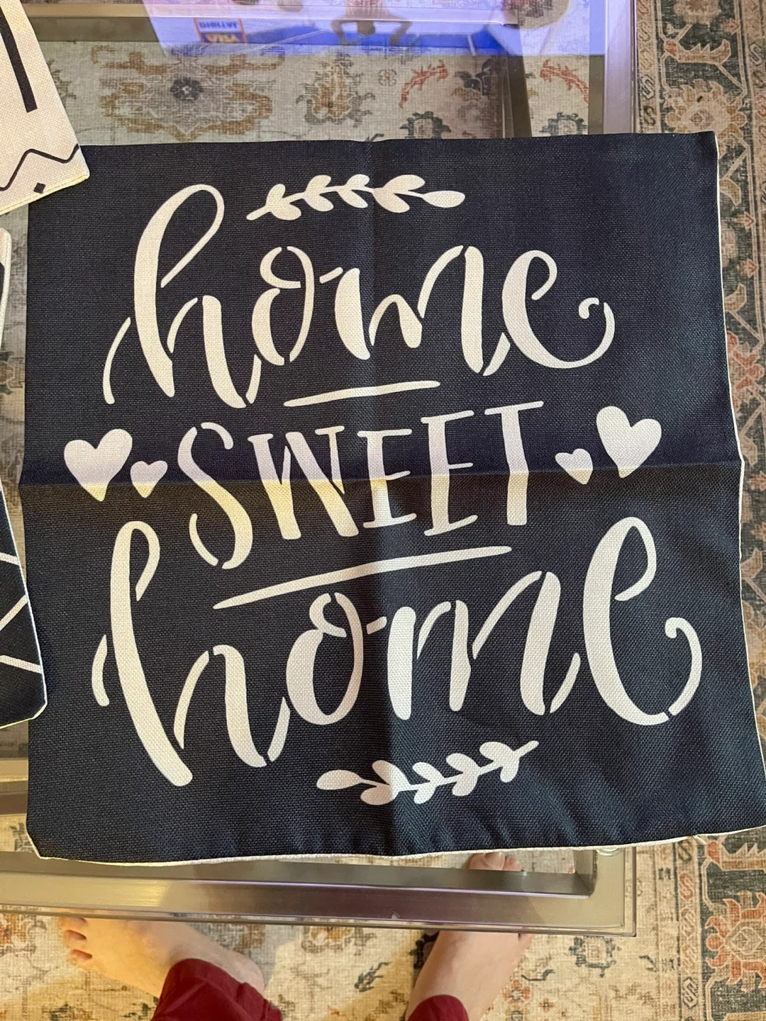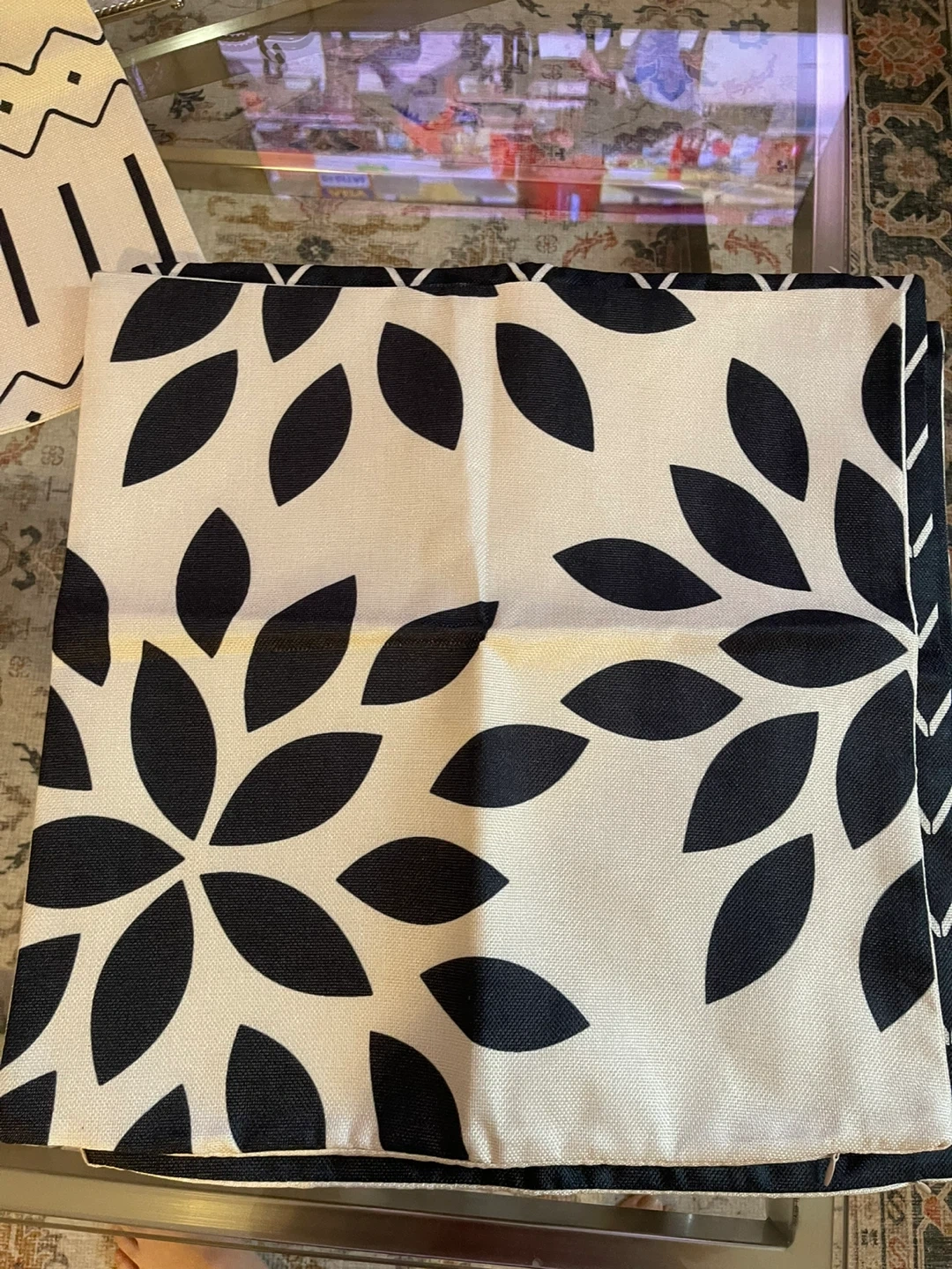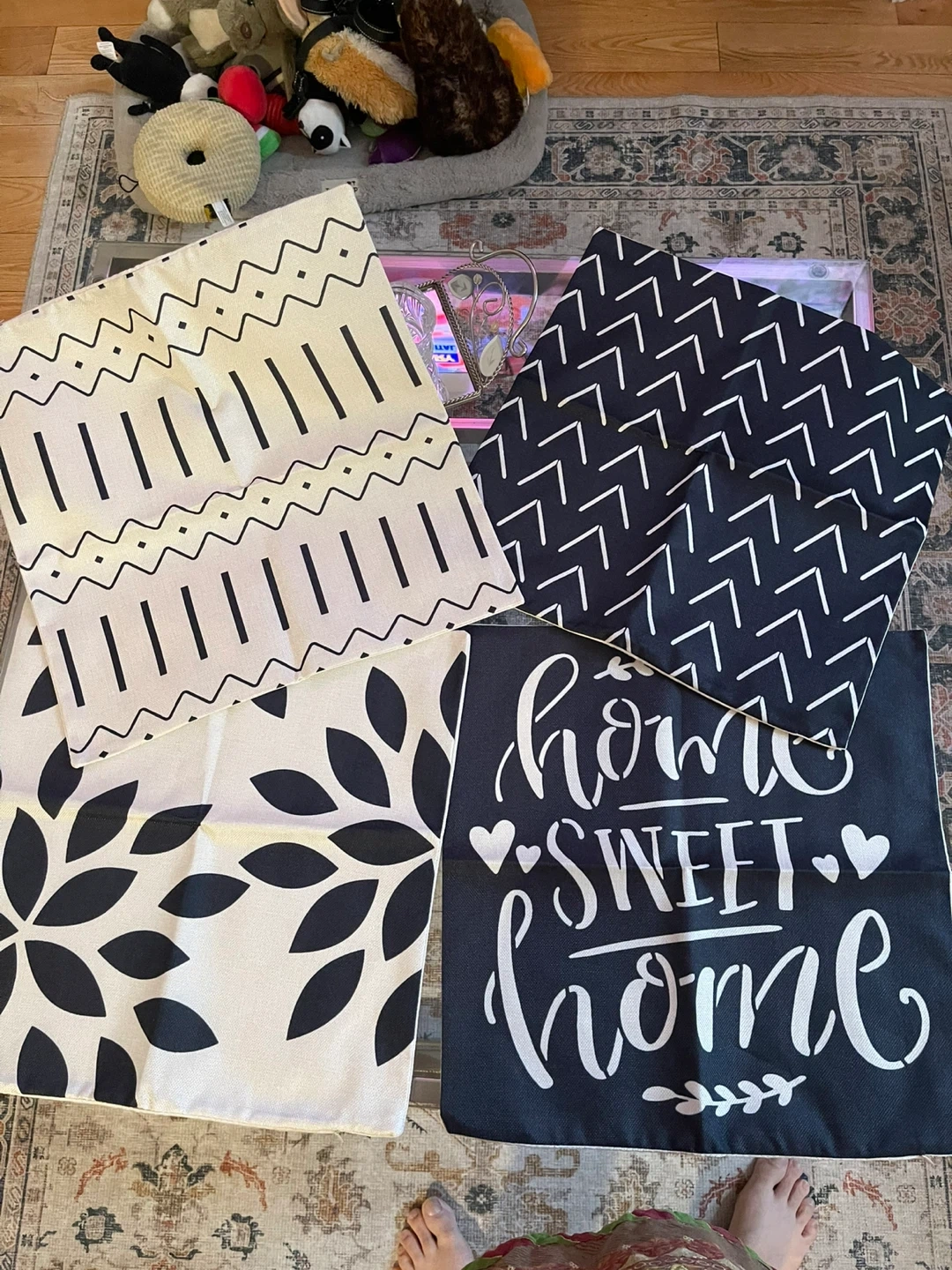 Spruce up your living space with this set of four decorative throw pillow covers! They feature a mix of black and white patterns, including geometric designs, leaf motifs, and a 'Home Sweet Home' print. Perfect for adding a touch of style to your couch or bed. 18”/18”