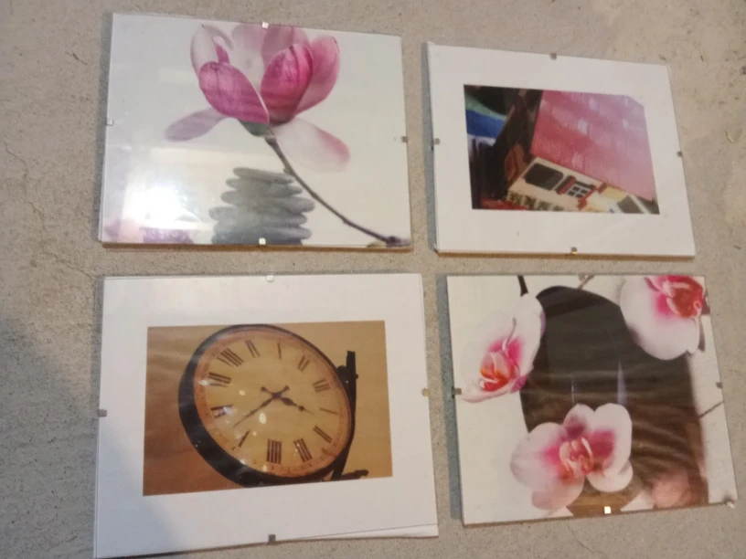 126Selling a set of four framed wall art prints. They feature a variety of images, including a magnolia, a house, a clock, and orchids. Great for adding a touch of decor to any room