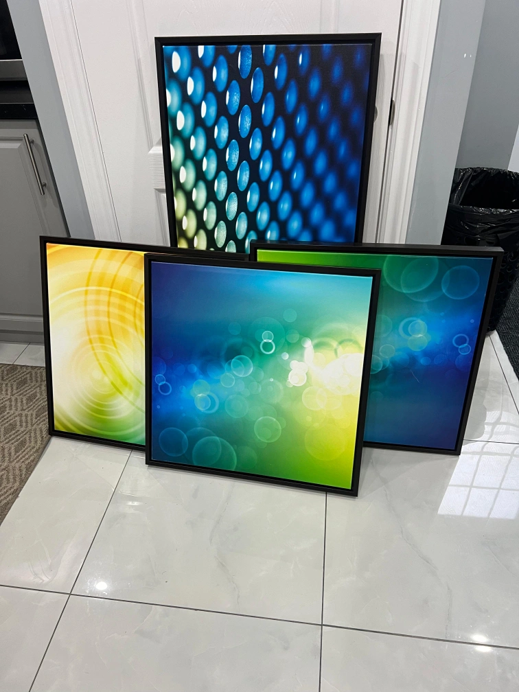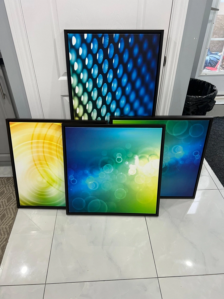 71Selling a set of 4 framed wall art pieces. They feature vibrant colours and modern designs. Perfect for adding a touch of style to any room in your home!
