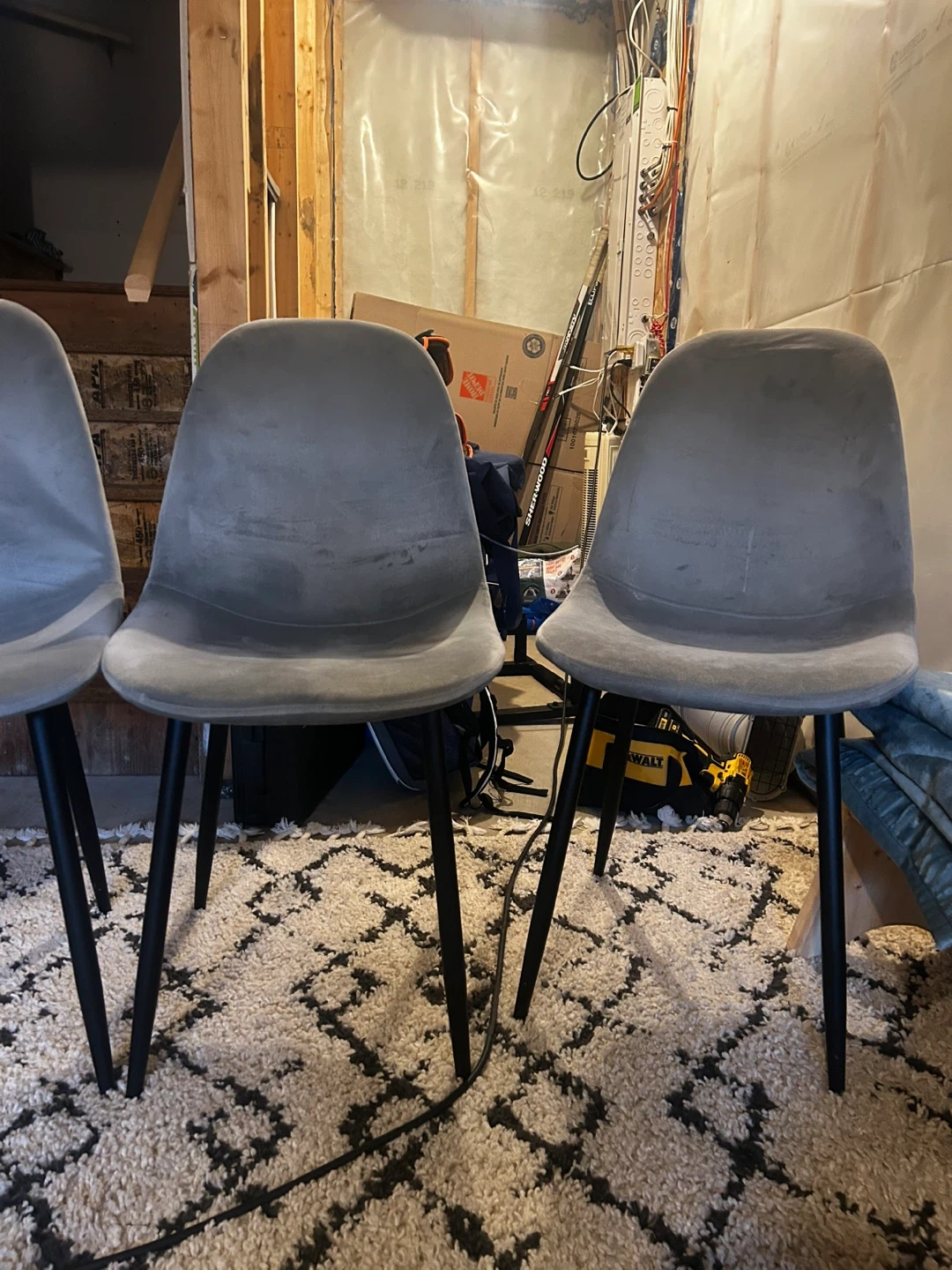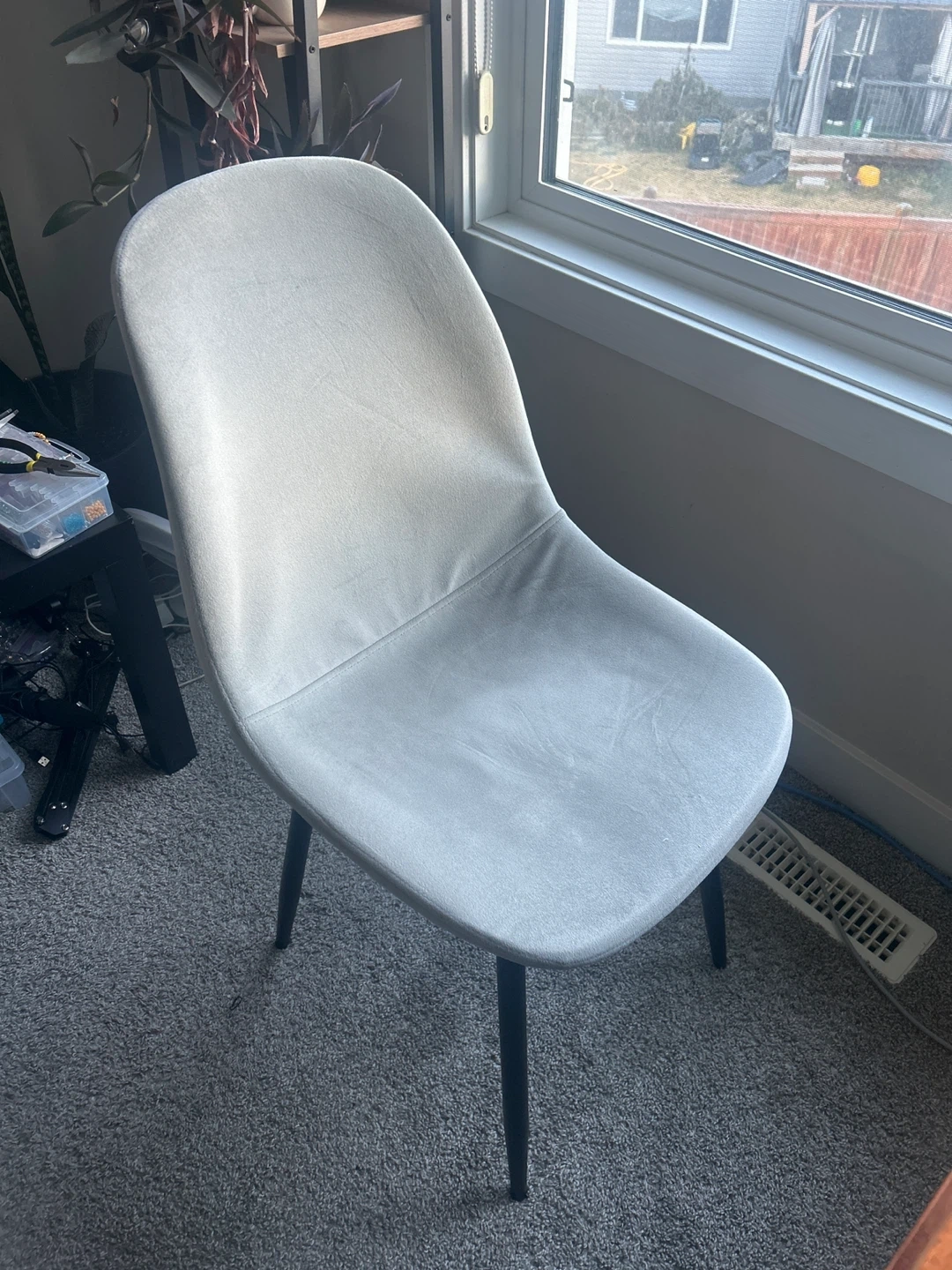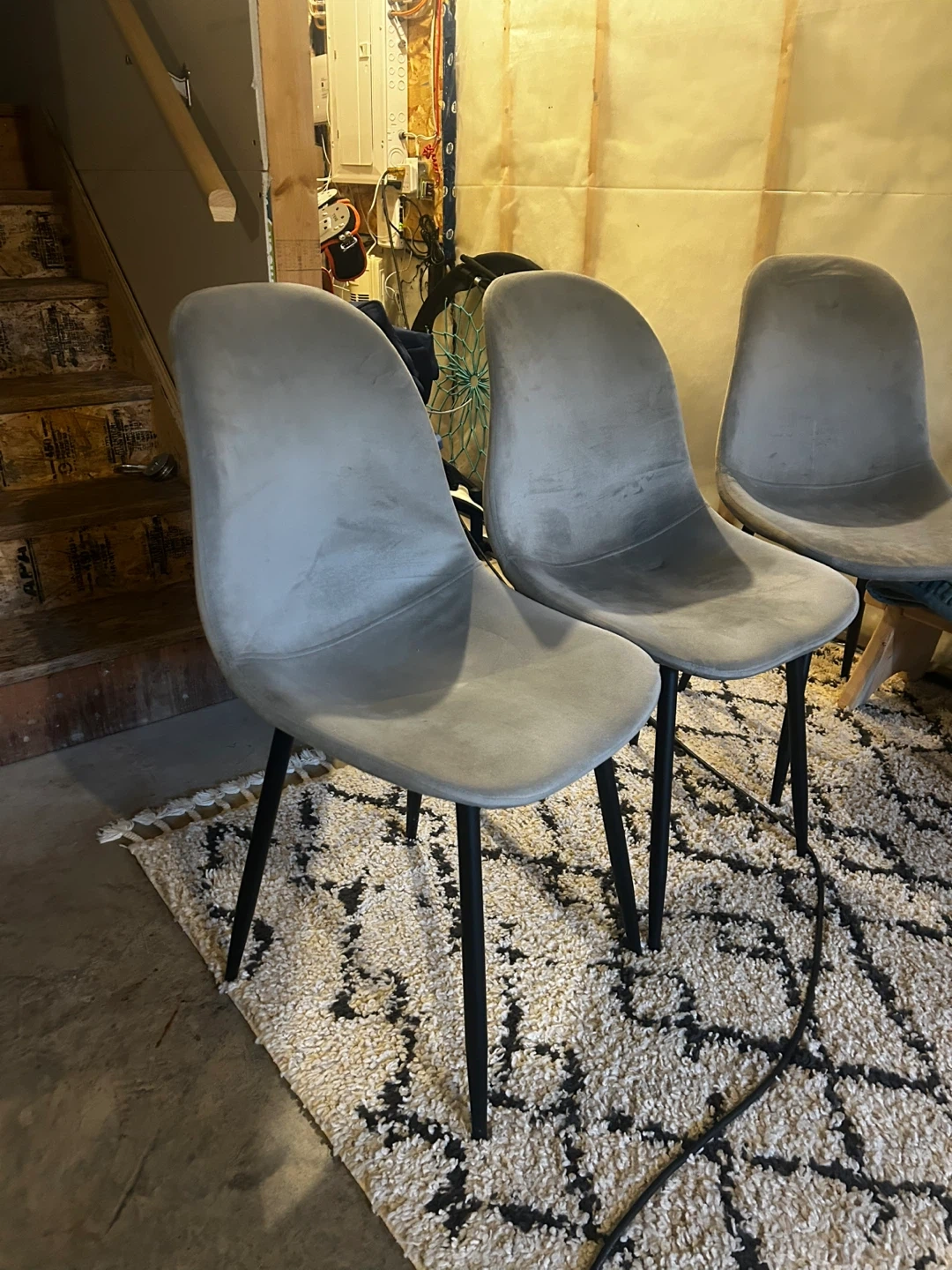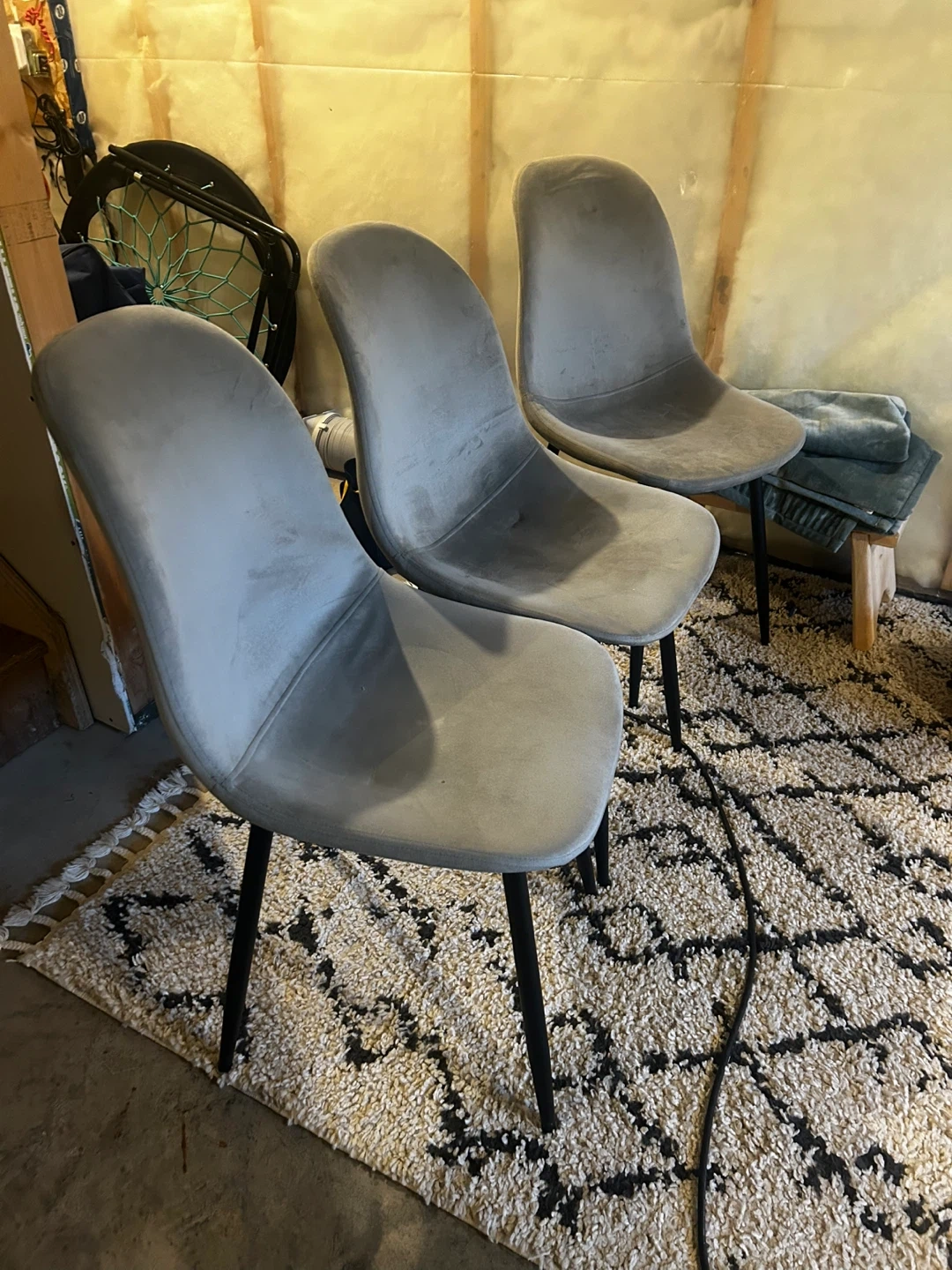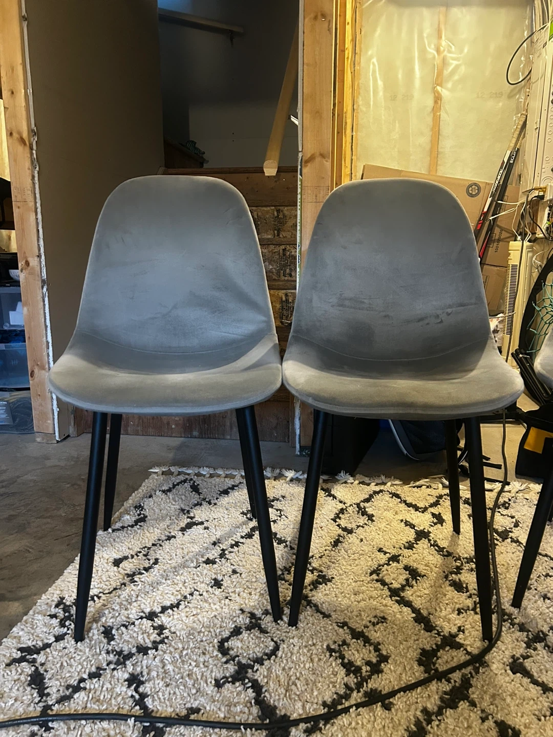 Grey velvet with black legs. They're in great shape - 3 were stored in the basement & never used. 1 is lightly used as an office chair. Pick up in Laurel crossing or Sherwood park - can meet anywhere $120 for all 4 paid $200